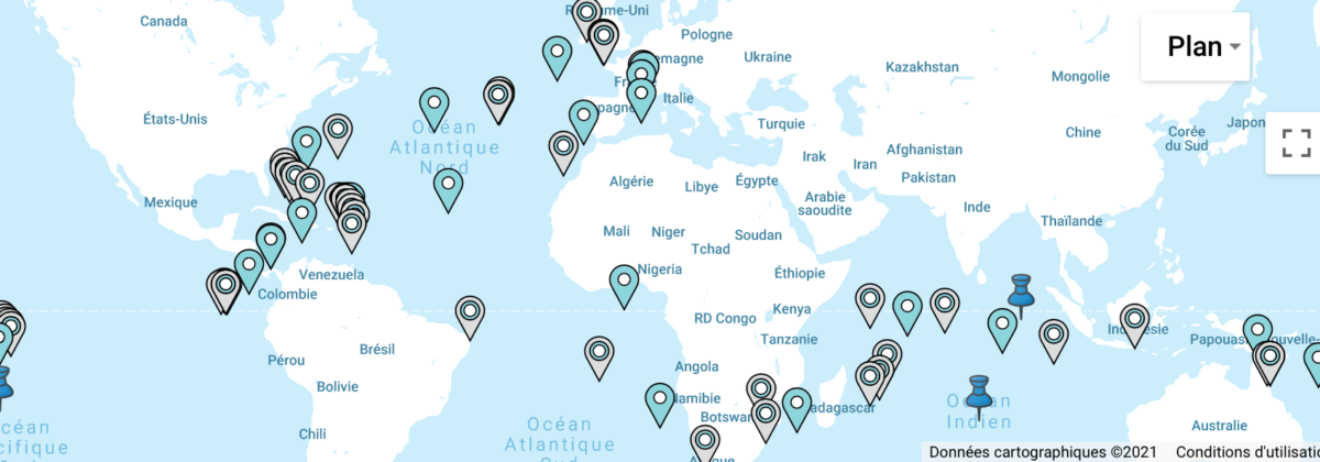 Tous les articles du blog ont été géolocalisés. En bleu/vert, ceux qui concernent la navigation. En gris les escales.
