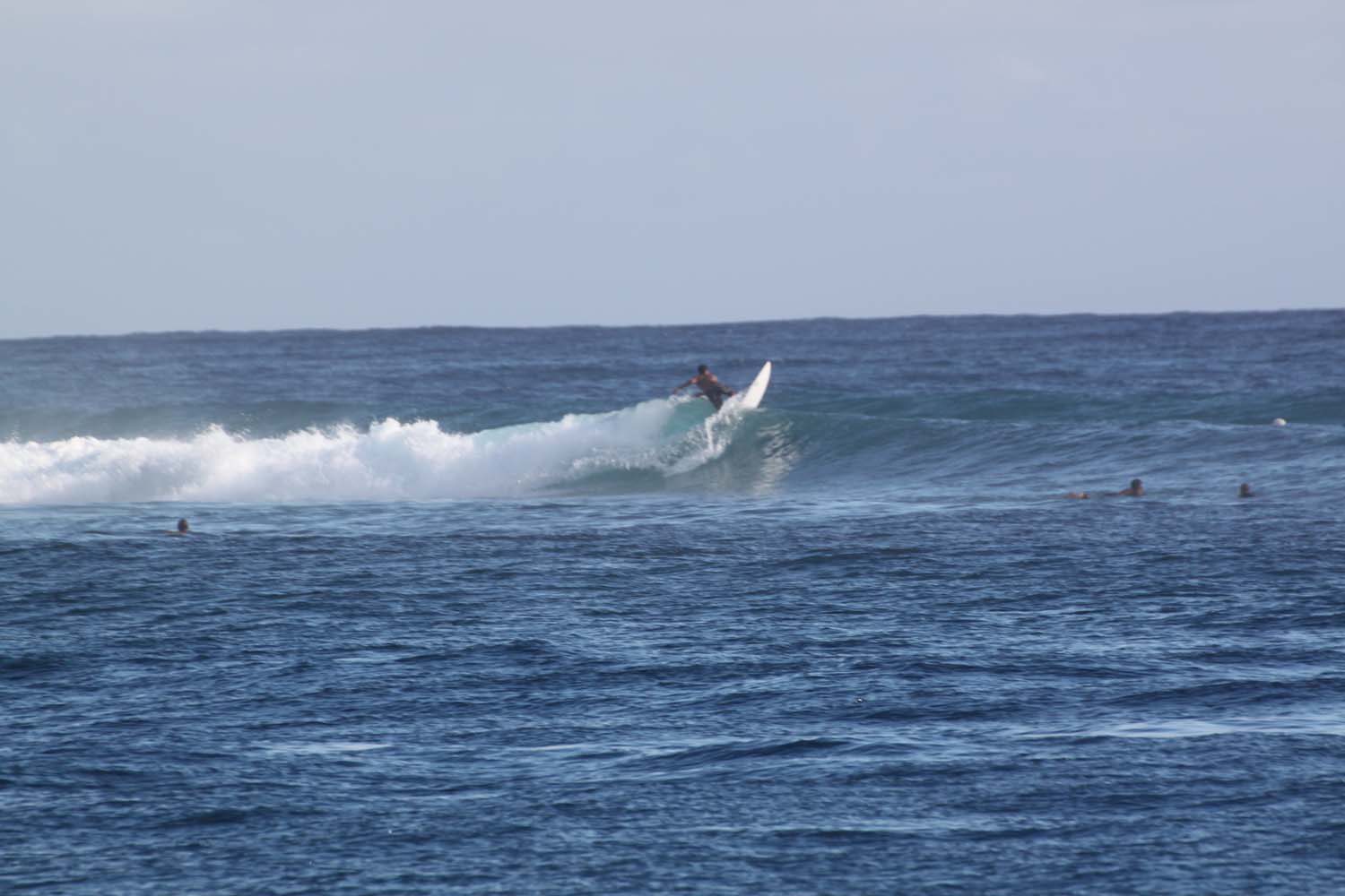 Après avoir passé 2h à coacher les enfants dans l’eau, nous les ramenons à bord  et repartons tous les deux en SUP surf.