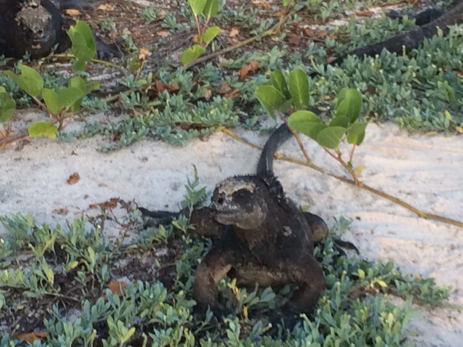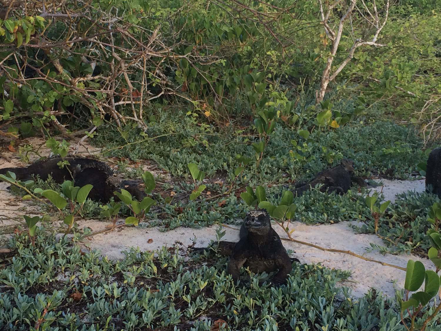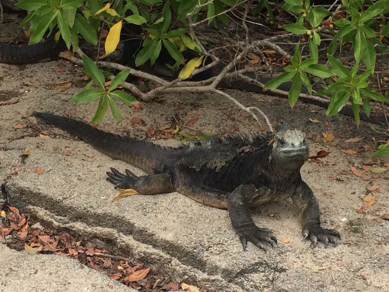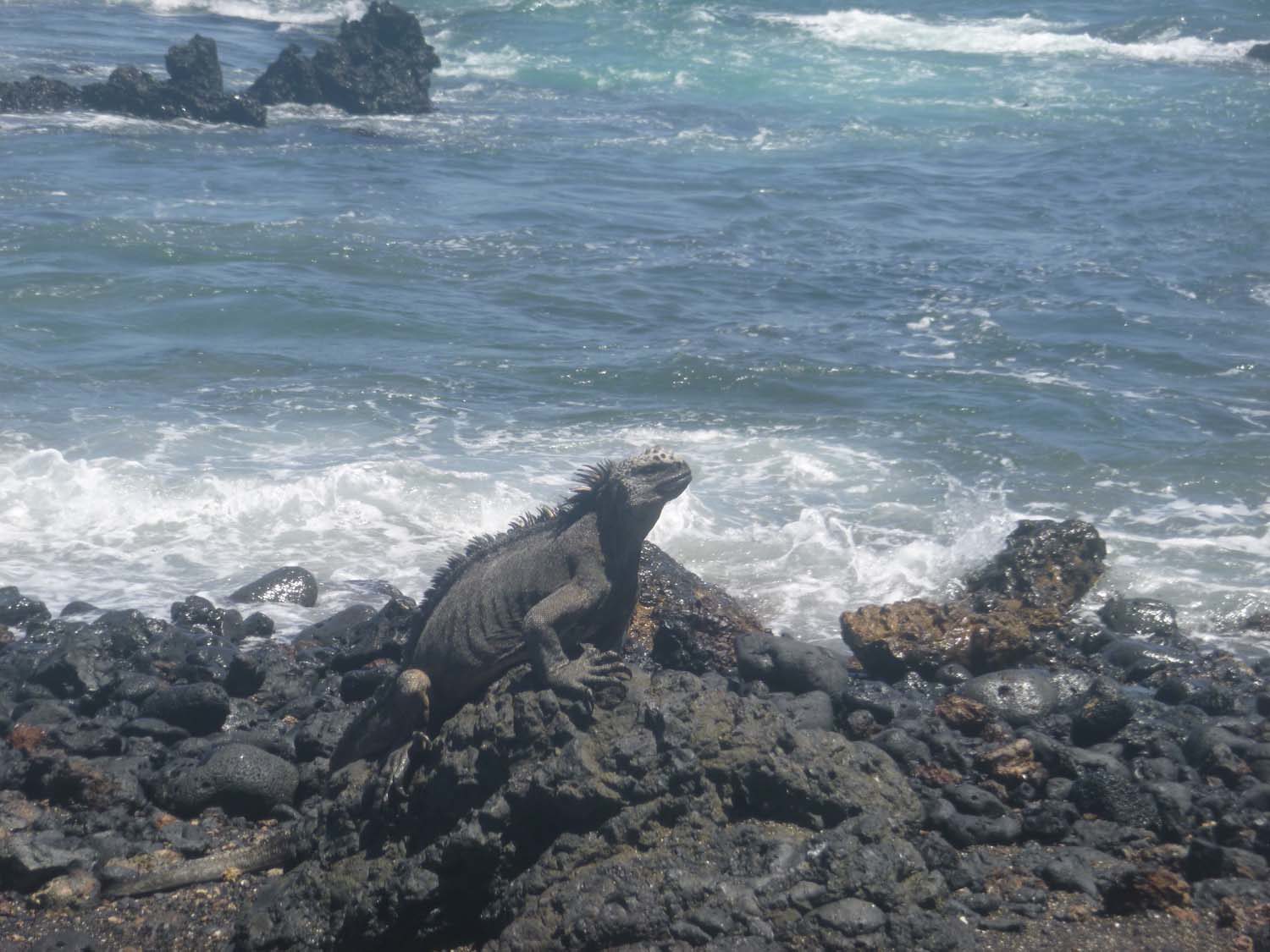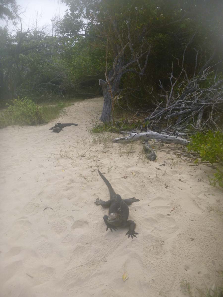 C’est notre premier contact avec les iguanes marins, qui ont des têtes et des corps impressionnants, très foncés de couleur, couverts d’écailles et d‘épines, avec un air patibulaire…. cependant, ils sont complètement inoffensifs puisque végétariens, et se nourrissant exclusivement d’algues : ils n’y a aucun risque de se faire croquer le pied! Ils sont en plus très lents, vraiment aucun risque donc!