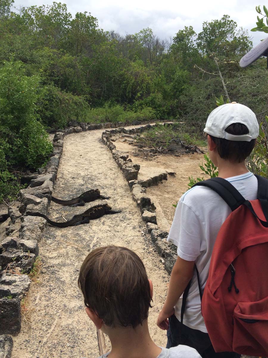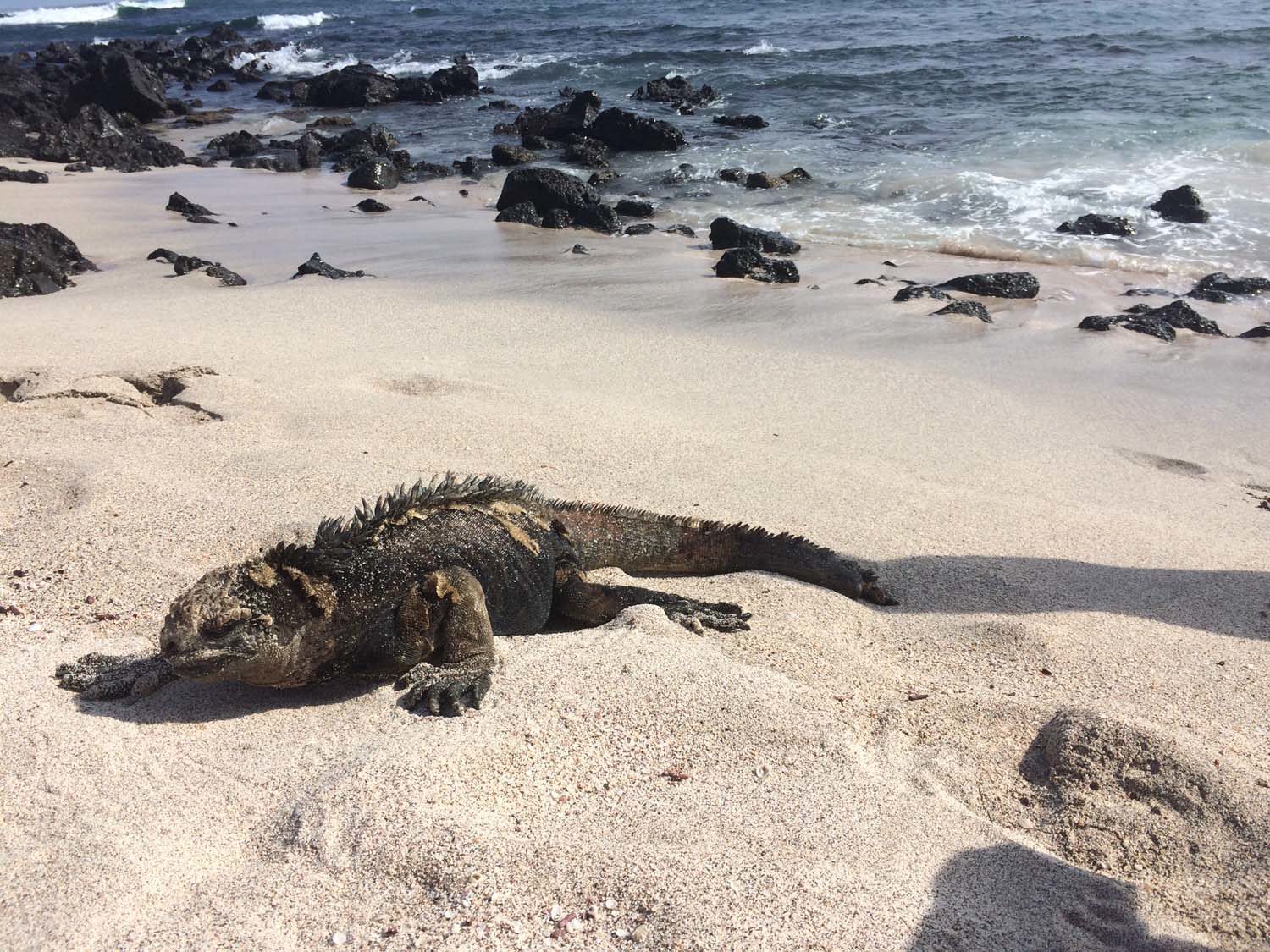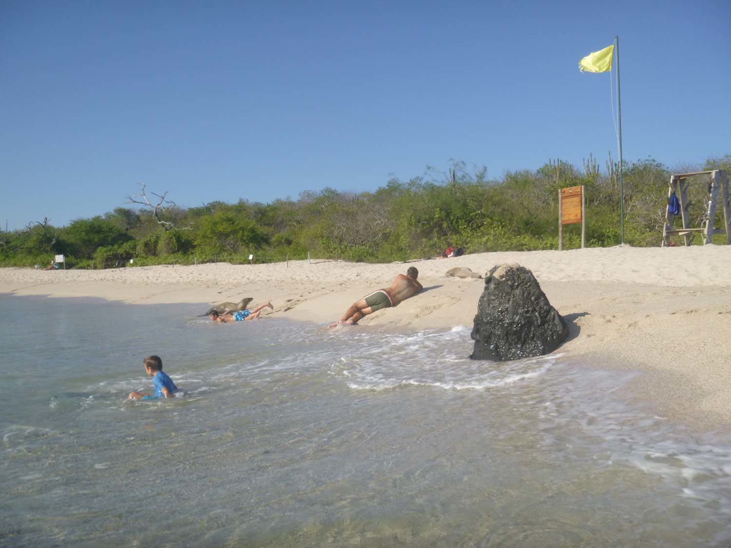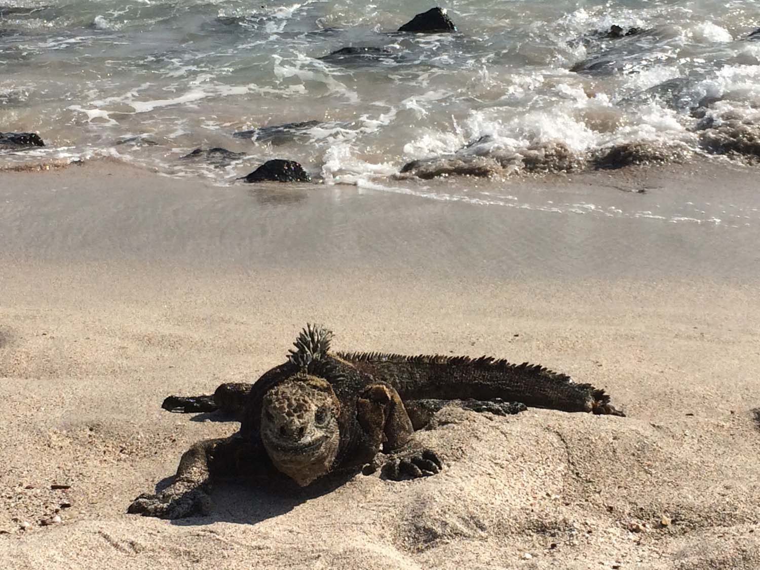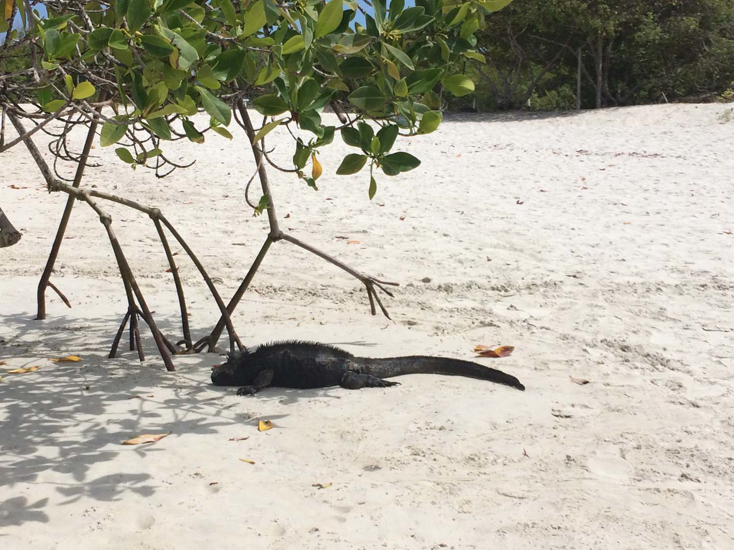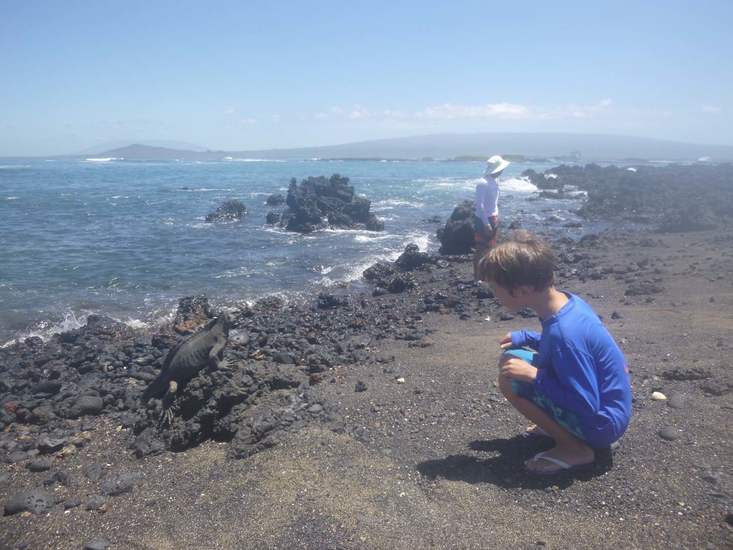 C’est notre premier contact avec les iguanes marins, qui ont des têtes et des corps impressionnants, très foncés de couleur, couverts d’écailles et d‘épines, avec un air patibulaire…. cependant, ils sont complètement inoffensifs puisque végétariens, et se nourrissant exclusivement d’algues : ils n’y a aucun risque de se faire croquer le pied! Ils sont en plus très lents, vraiment aucun risque donc!
