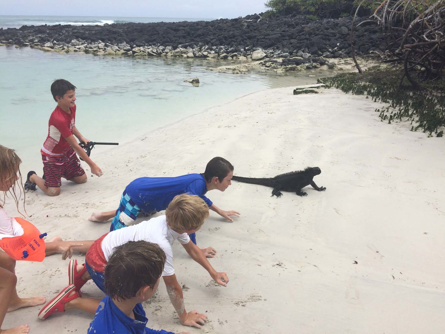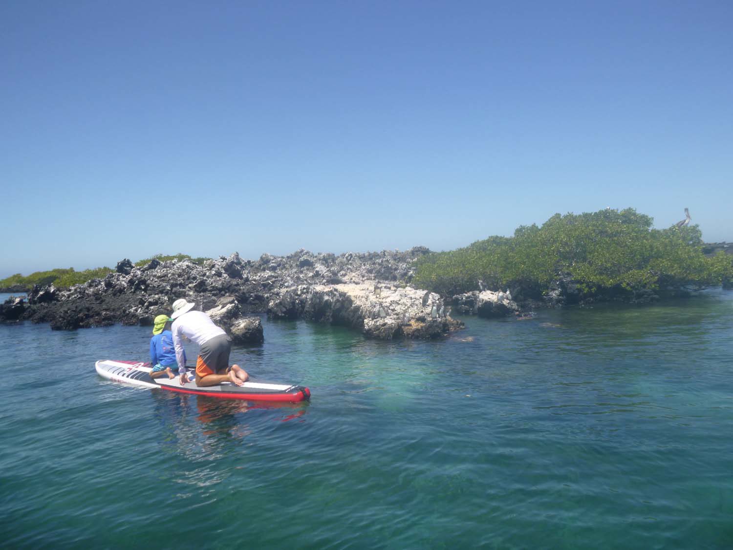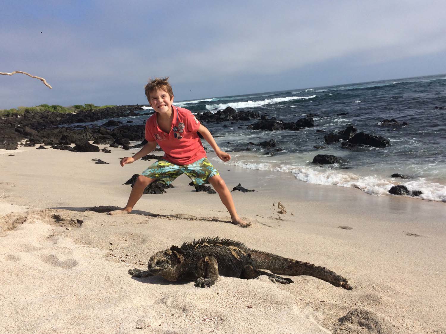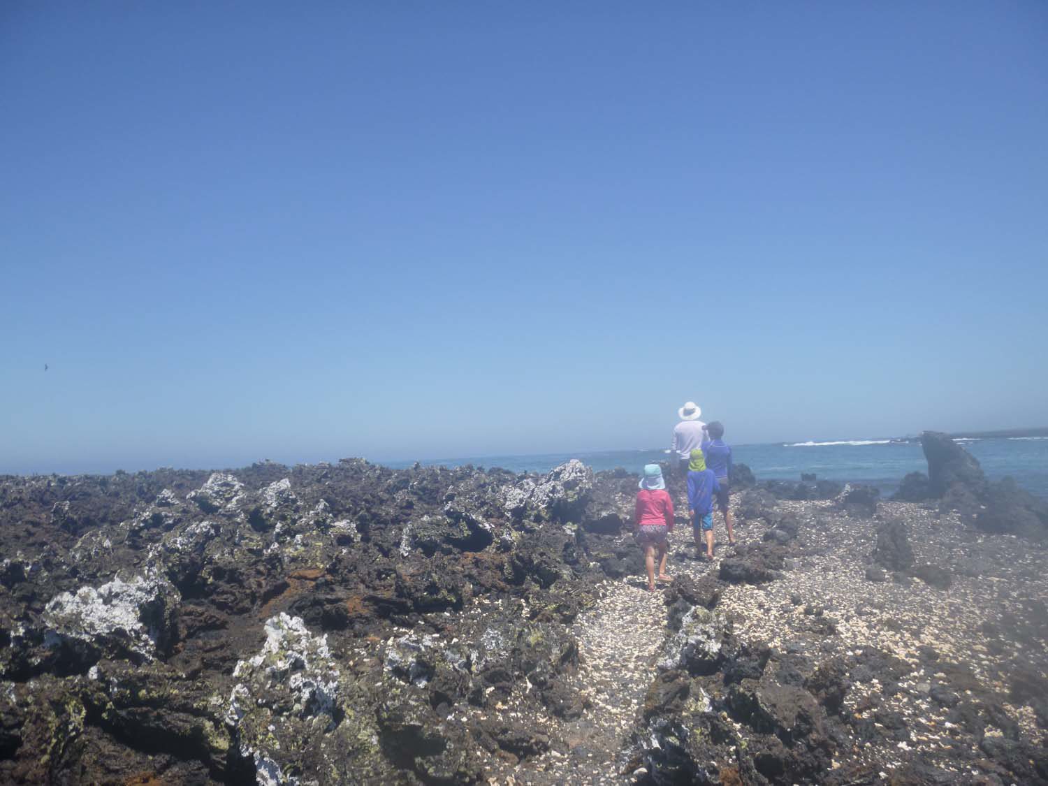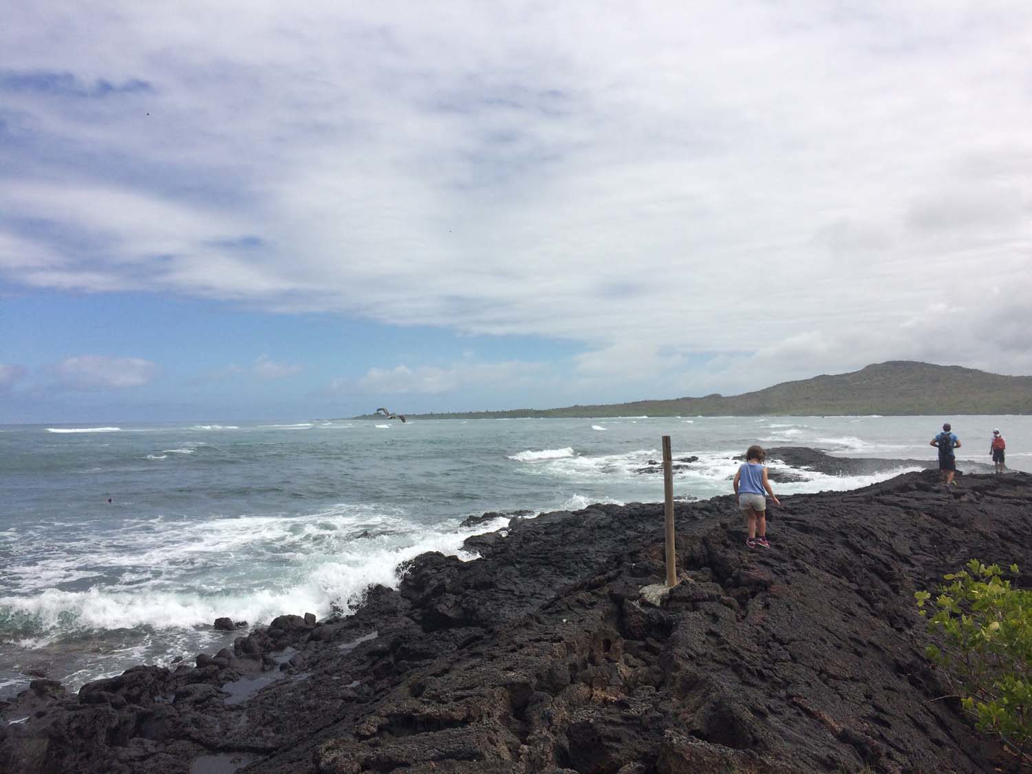 C’est notre premier contact avec les iguanes marins, qui ont des têtes et des corps impressionnants, très foncés de couleur, couverts d’écailles et d‘épines, avec un air patibulaire…. cependant, ils sont complètement inoffensifs puisque végétariens, et se nourrissant exclusivement d’algues : ils n’y a aucun risque de se faire croquer le pied! Ils sont en plus très lents, vraiment aucun risque donc!