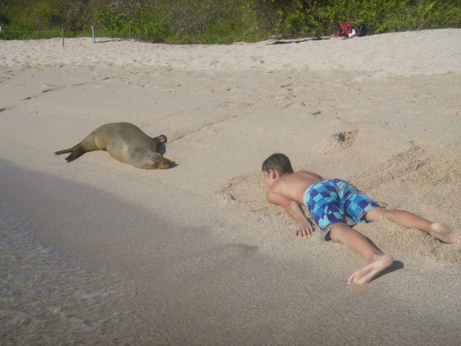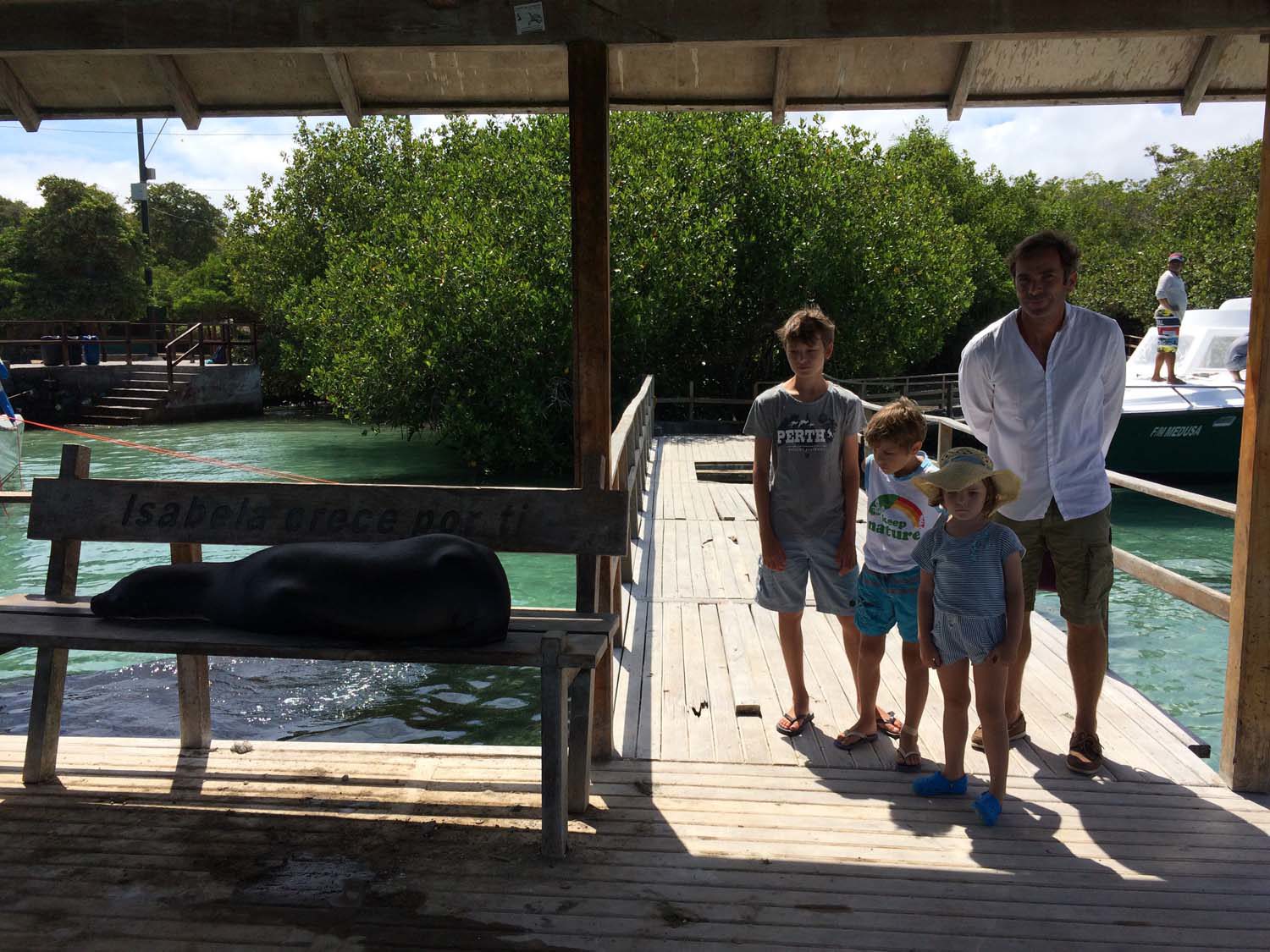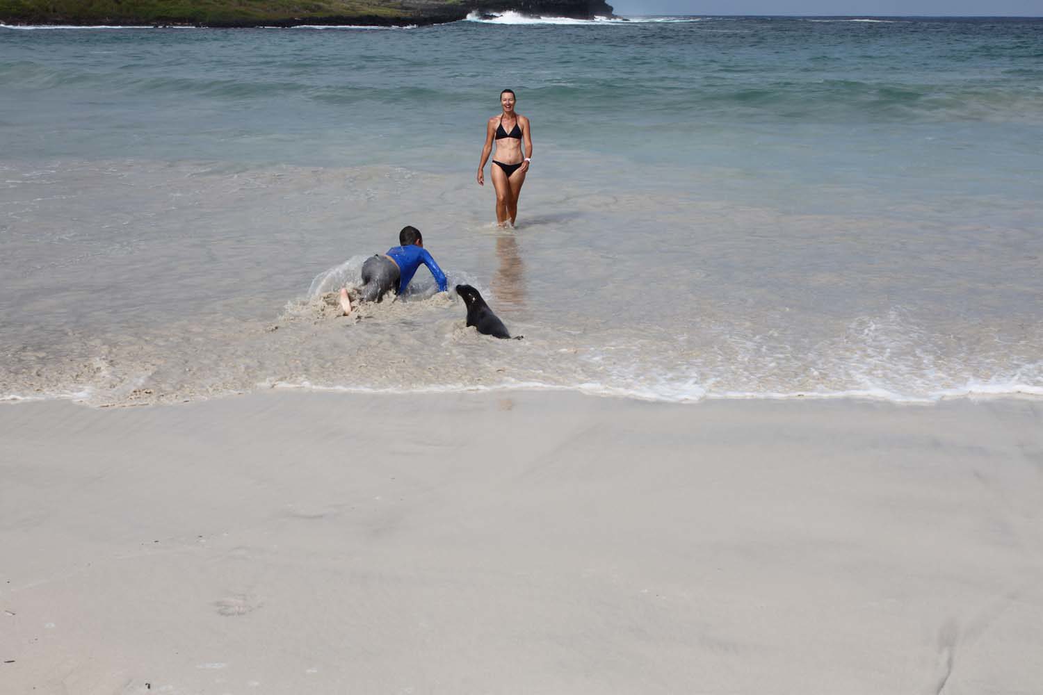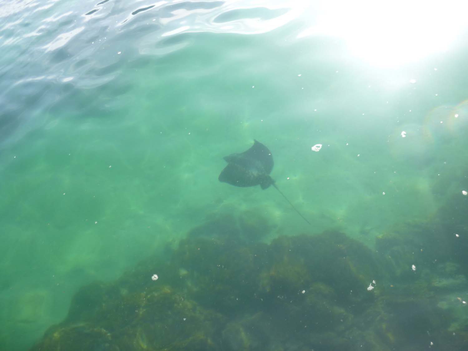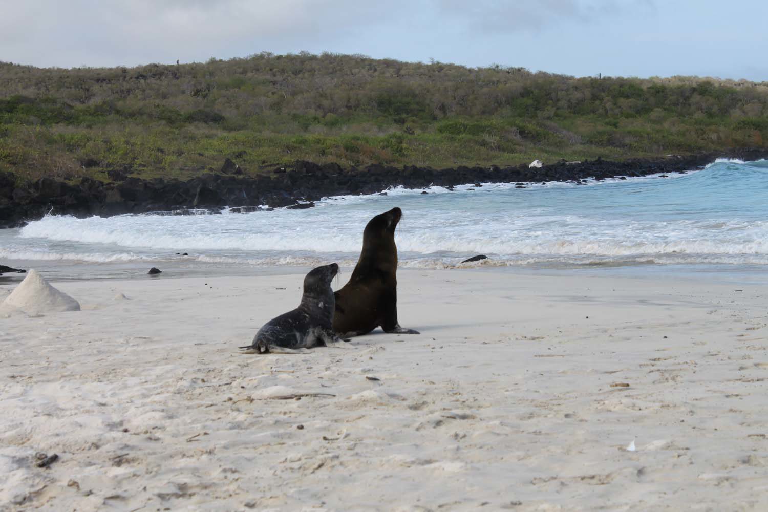 C’est notre premier contact avec les iguanes marins, qui ont des têtes et des corps impressionnants, très foncés de couleur, couverts d’écailles et d‘épines, avec un air patibulaire…. cependant, ils sont complètement inoffensifs puisque végétariens, et se nourrissant exclusivement d’algues : ils n’y a aucun risque de se faire croquer le pied! Ils sont en plus très lents, vraiment aucun risque donc!