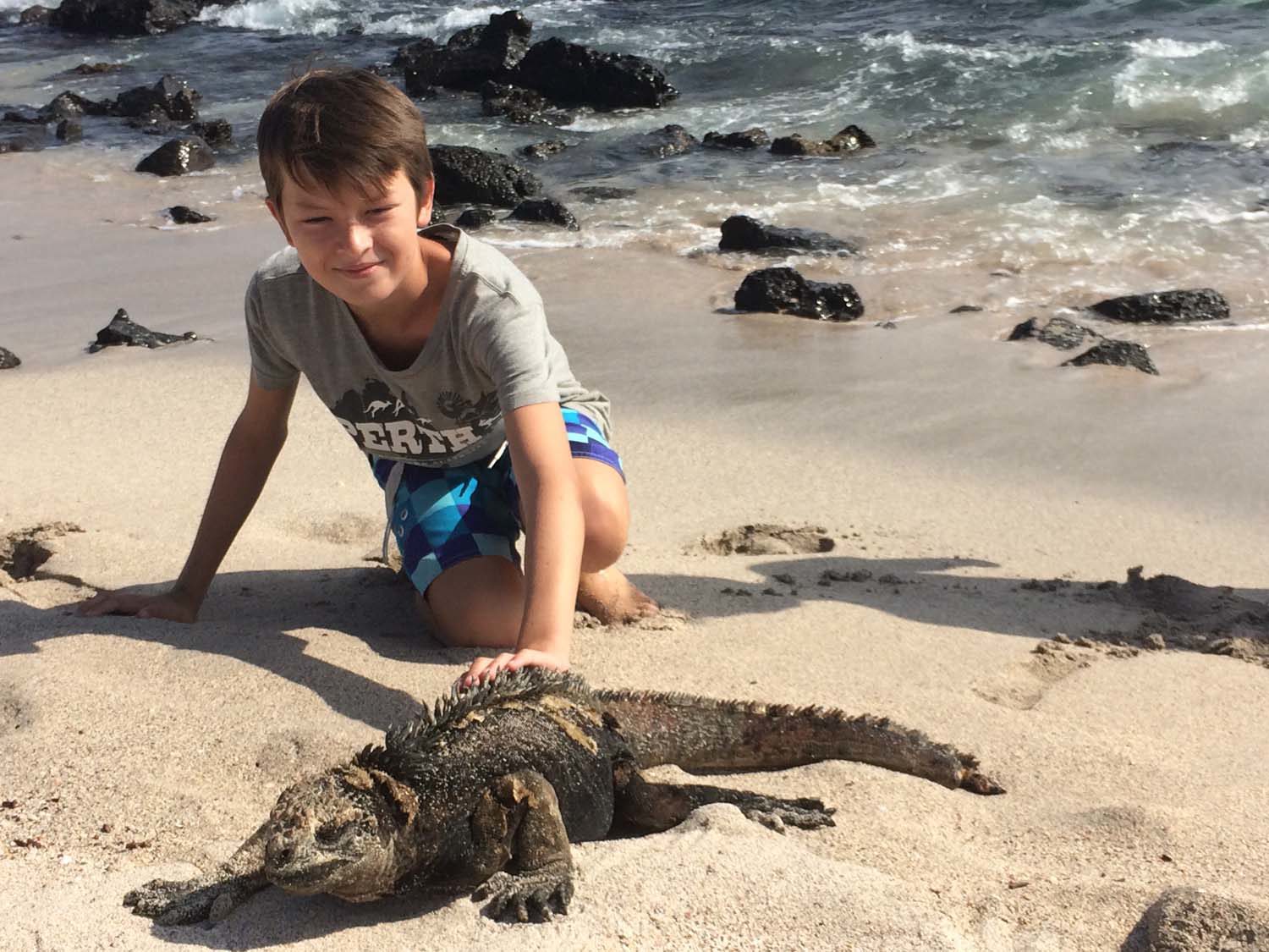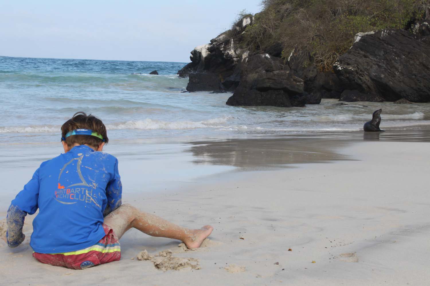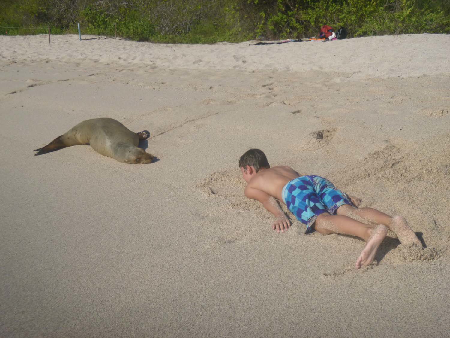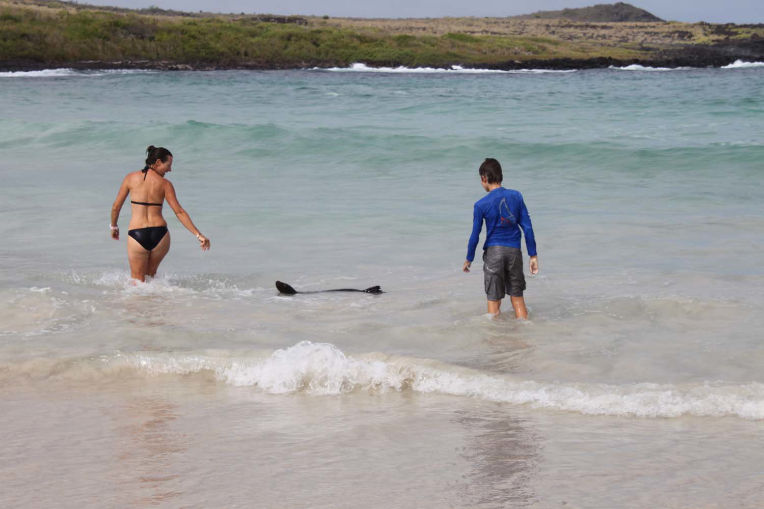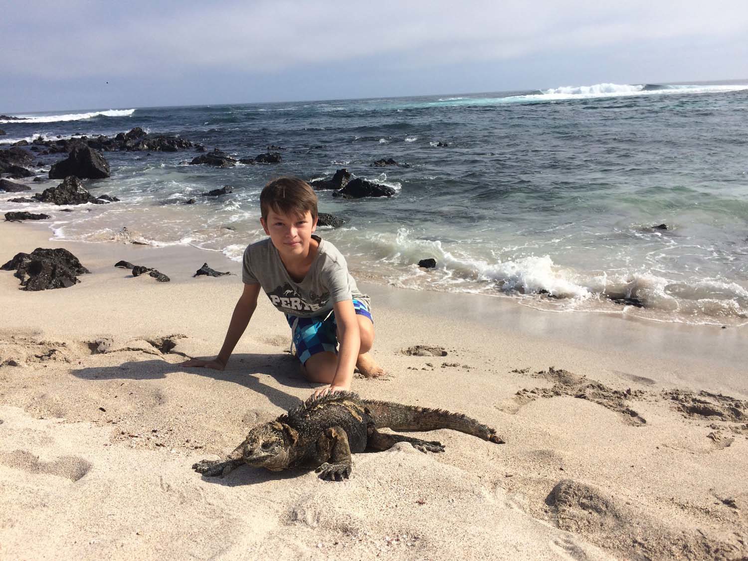 C’est notre premier contact avec les iguanes marins, qui ont des têtes et des corps impressionnants, très foncés de couleur, couverts d’écailles et d‘épines, avec un air patibulaire…. cependant, ils sont complètement inoffensifs puisque végétariens, et se nourrissant exclusivement d’algues : ils n’y a aucun risque de se faire croquer le pied! Ils sont en plus très lents, vraiment aucun risque donc!