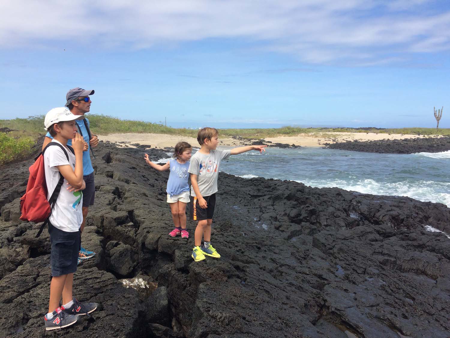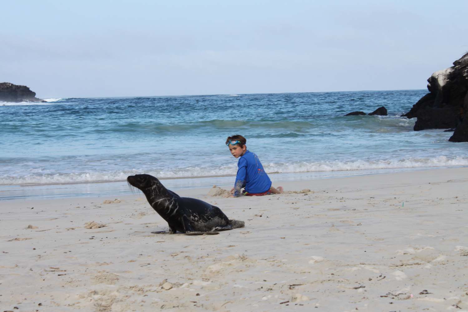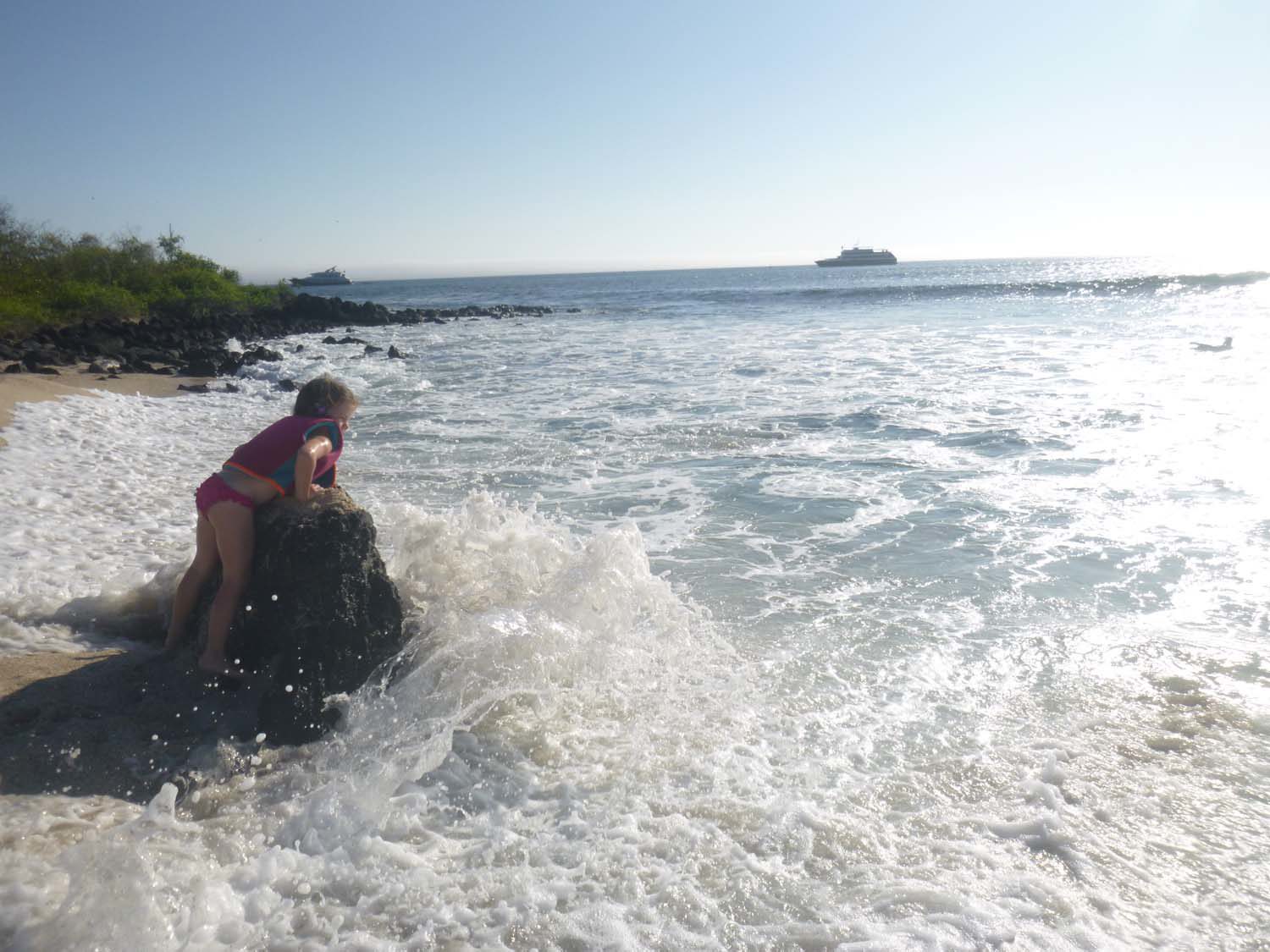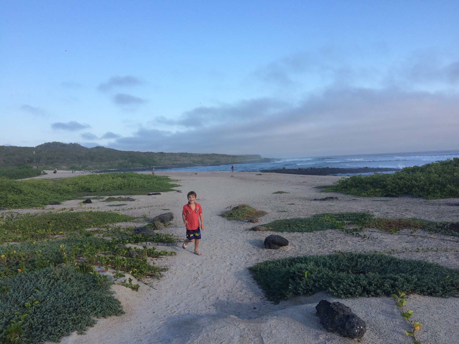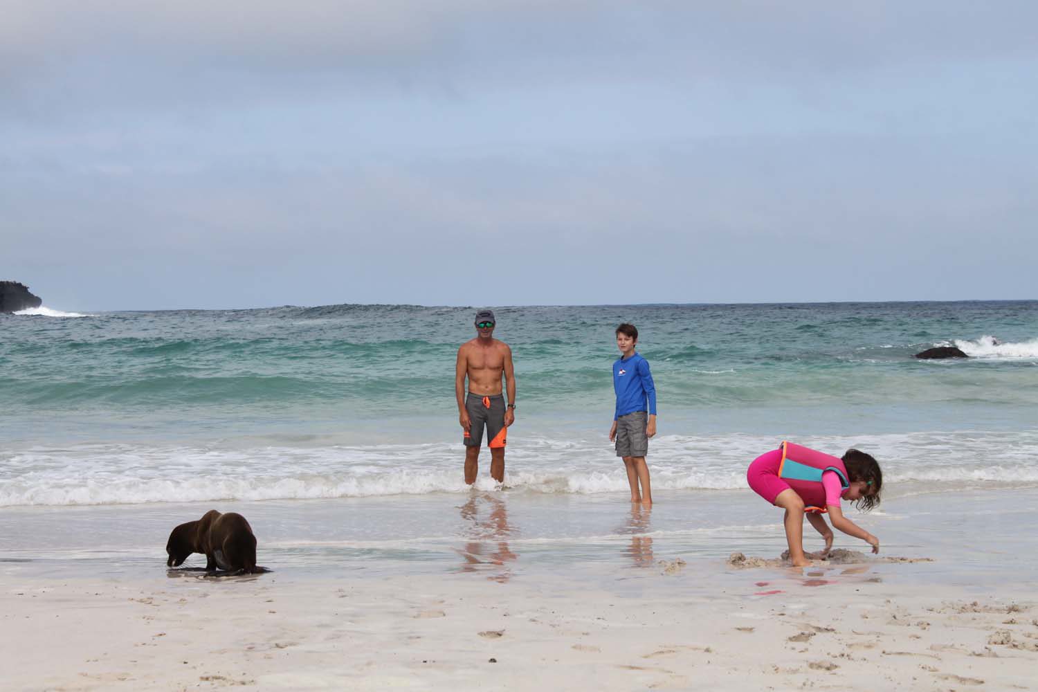 C’est notre premier contact avec les iguanes marins, qui ont des têtes et des corps impressionnants, très foncés de couleur, couverts d’écailles et d‘épines, avec un air patibulaire…. cependant, ils sont complètement inoffensifs puisque végétariens, et se nourrissant exclusivement d’algues : ils n’y a aucun risque de se faire croquer le pied! Ils sont en plus très lents, vraiment aucun risque donc!