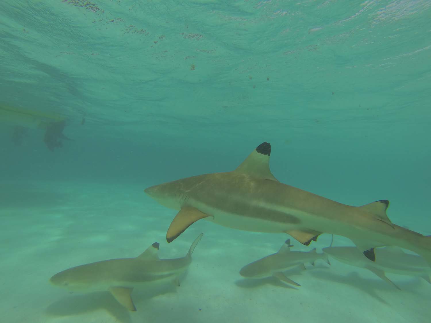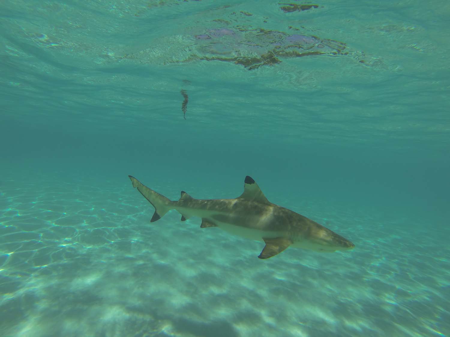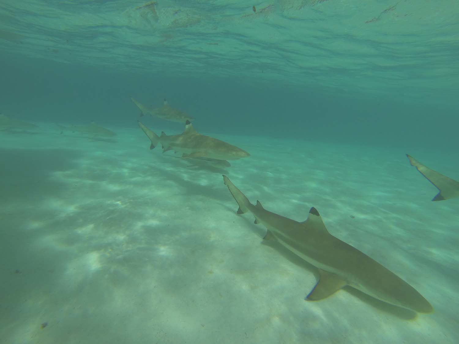 mais le sens de l’accueil est comment dire….axé sur le porte-monnaie : on nous réclame pour débarquer une taxe de « landing fee » de 10 dollars… par personne! Et pas de discount pour les enfants…. Nous observons quelques minutes, depuis l’annexe, les requins nourrice tourner et virer dans une eau limpide puis faisons poliment demi-tour.