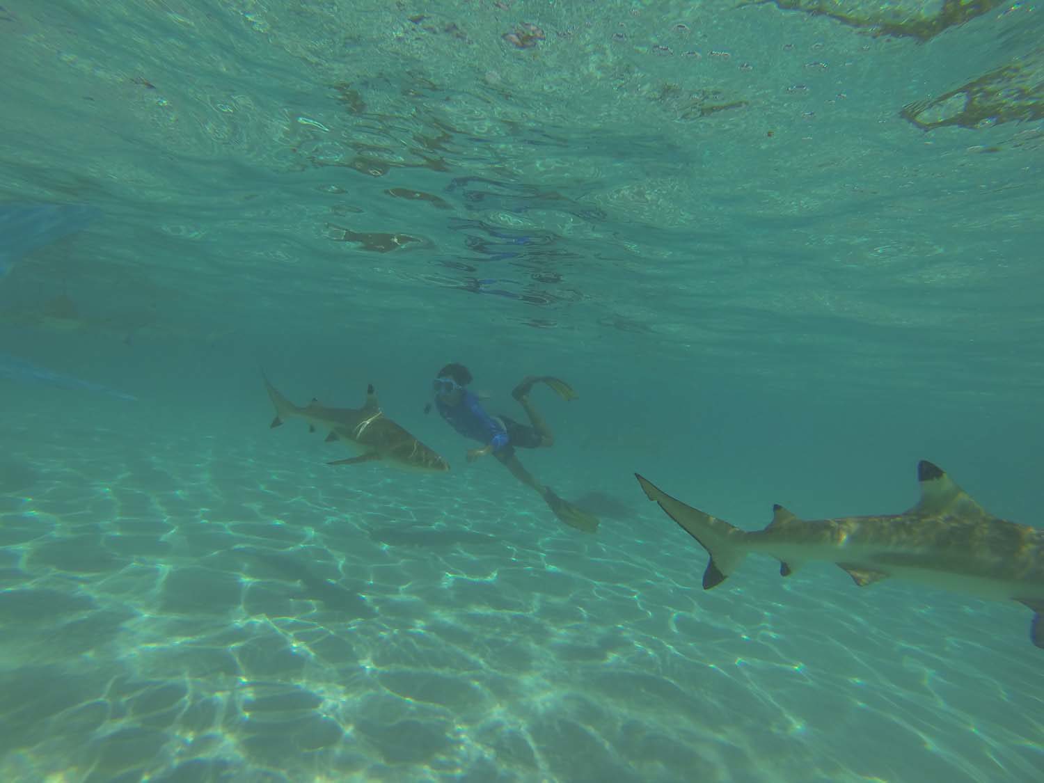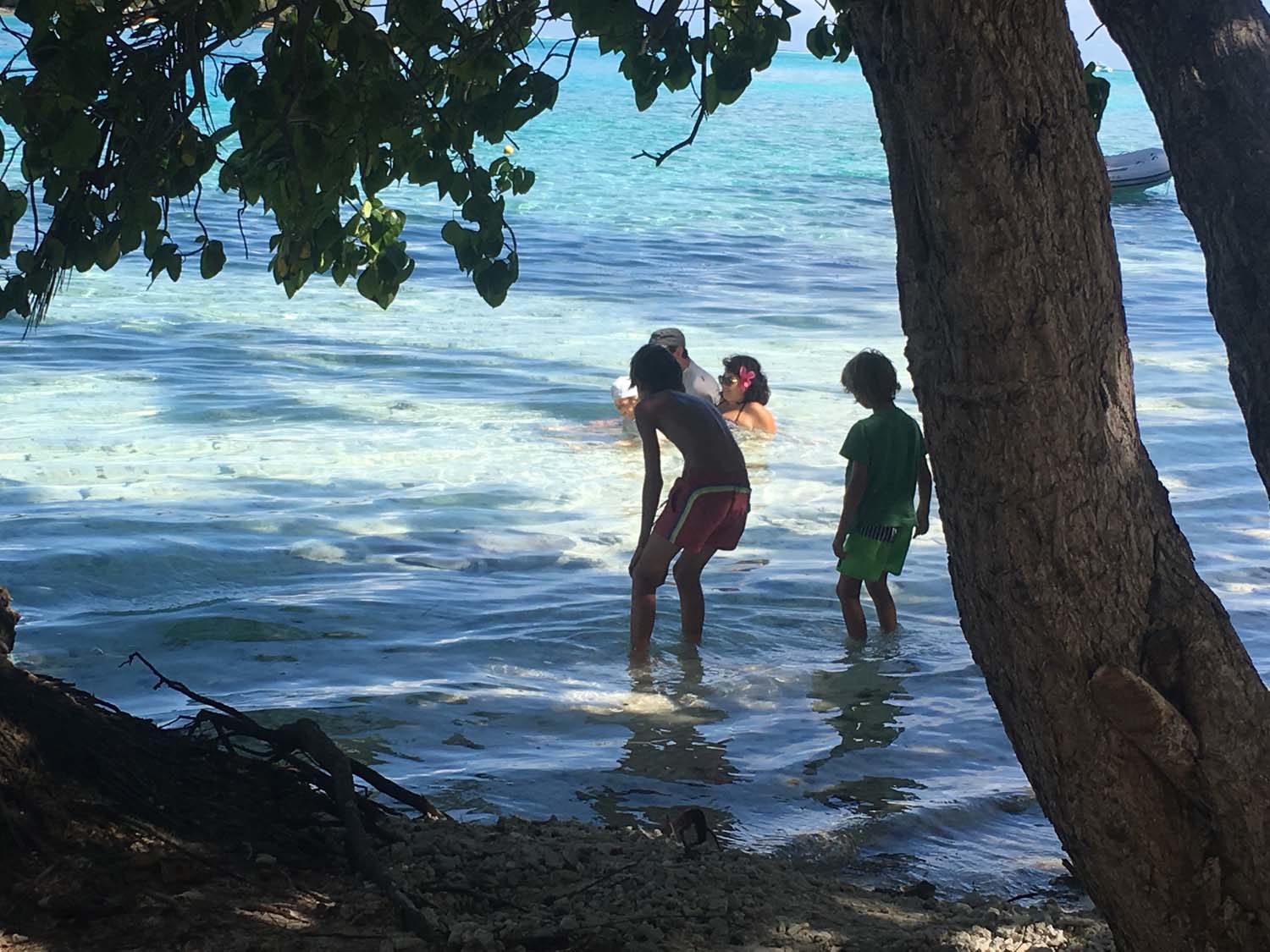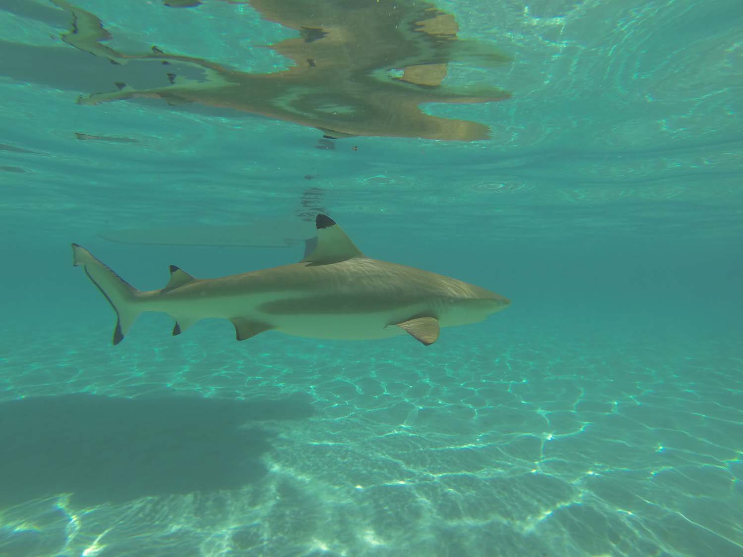 mais le sens de l’accueil est comment dire….axé sur le porte-monnaie : on nous réclame pour débarquer une taxe de « landing fee » de 10 dollars… par personne! Et pas de discount pour les enfants…. Nous observons quelques minutes, depuis l’annexe, les requins nourrice tourner et virer dans une eau limpide puis faisons poliment demi-tour.