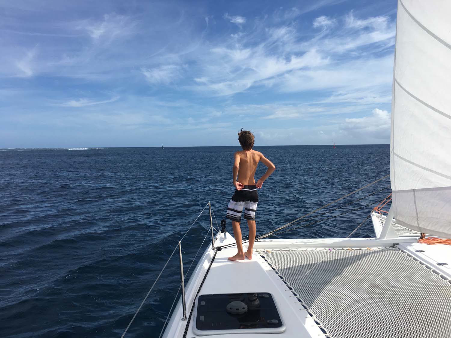 Nous quittons Compass Cay en bordure de grain, il y a plus de 20 noeuds de vent, et Loïc nous montre sa dextérité à piloter Moby : car pour aller du nord de Hall’s Ponds Cay au mouillage sud de Warderick’s Wells, un chenal sinueux nous fait passer entre de petites îles. Victor et moi surveillons la nav’ chacun dans une des étraves.