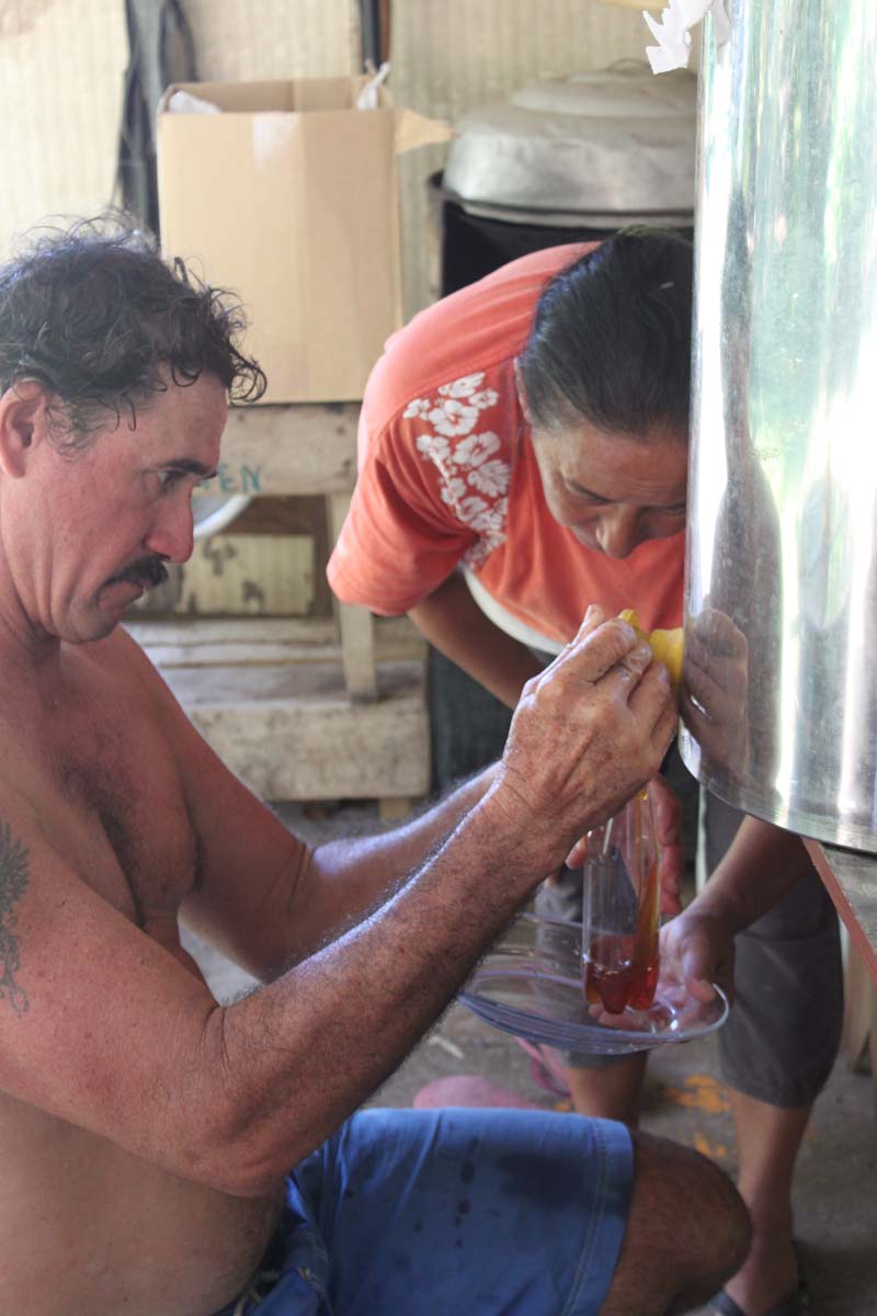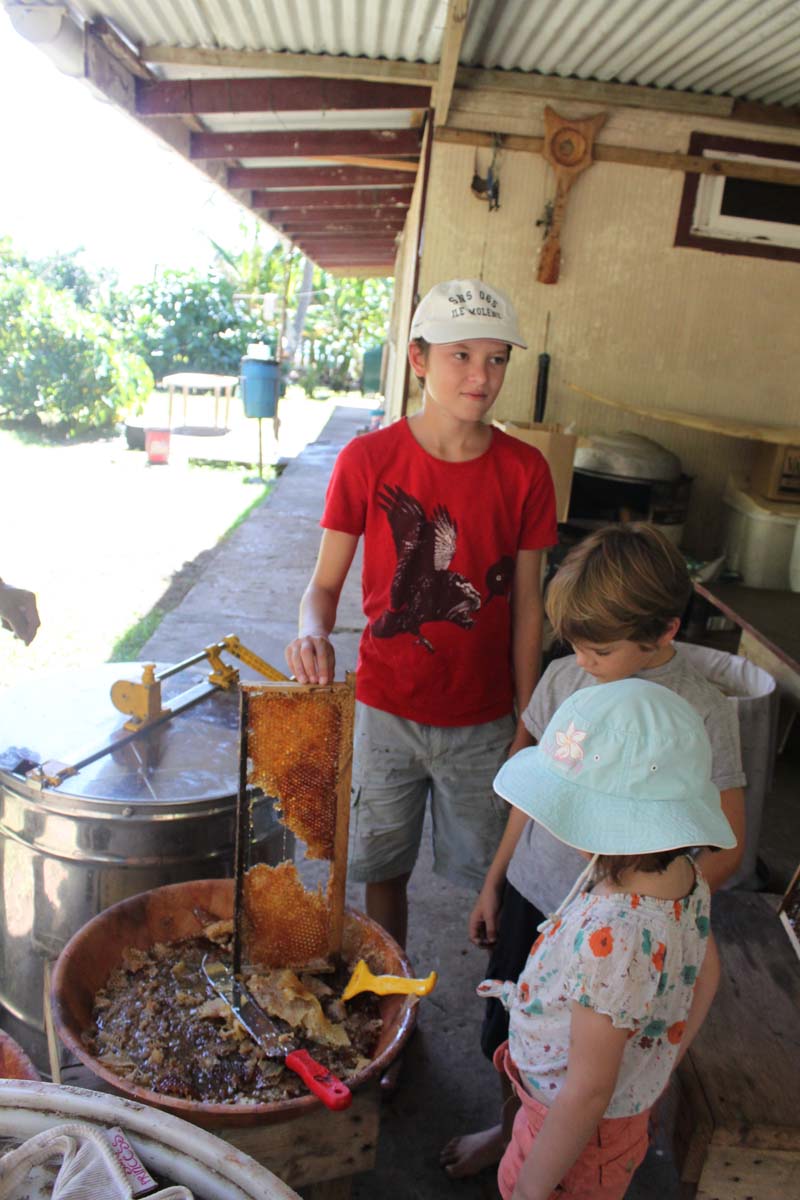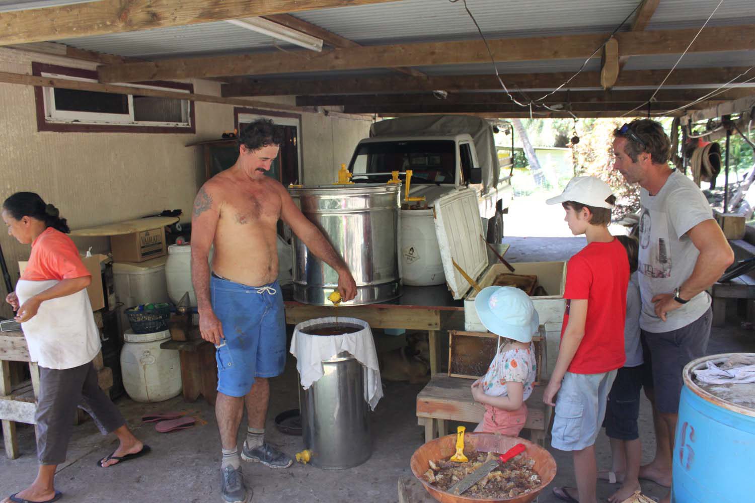 Au passage, nous nous arrêtons chez Lucien O’Connor, dont le grand-père irlandais avait fait escale en voilier au début du siècle dernier, et n’en est jamais reparti. IL exploite avec ses 3 frères la vallée voisine, plantés de centaines de pamplemousses, bananiers, citronniers…. Les O’Connor sont des bosseurs nous dit John. En effet, non content d’exploiter sa ferme, Lucien s’est mis sérieusement au miel s’est formé auprès d’apiculteurs français, et produit une merveille de miel doré et parfumé.