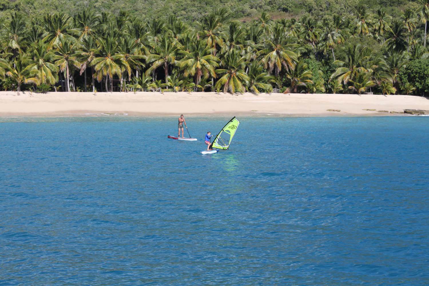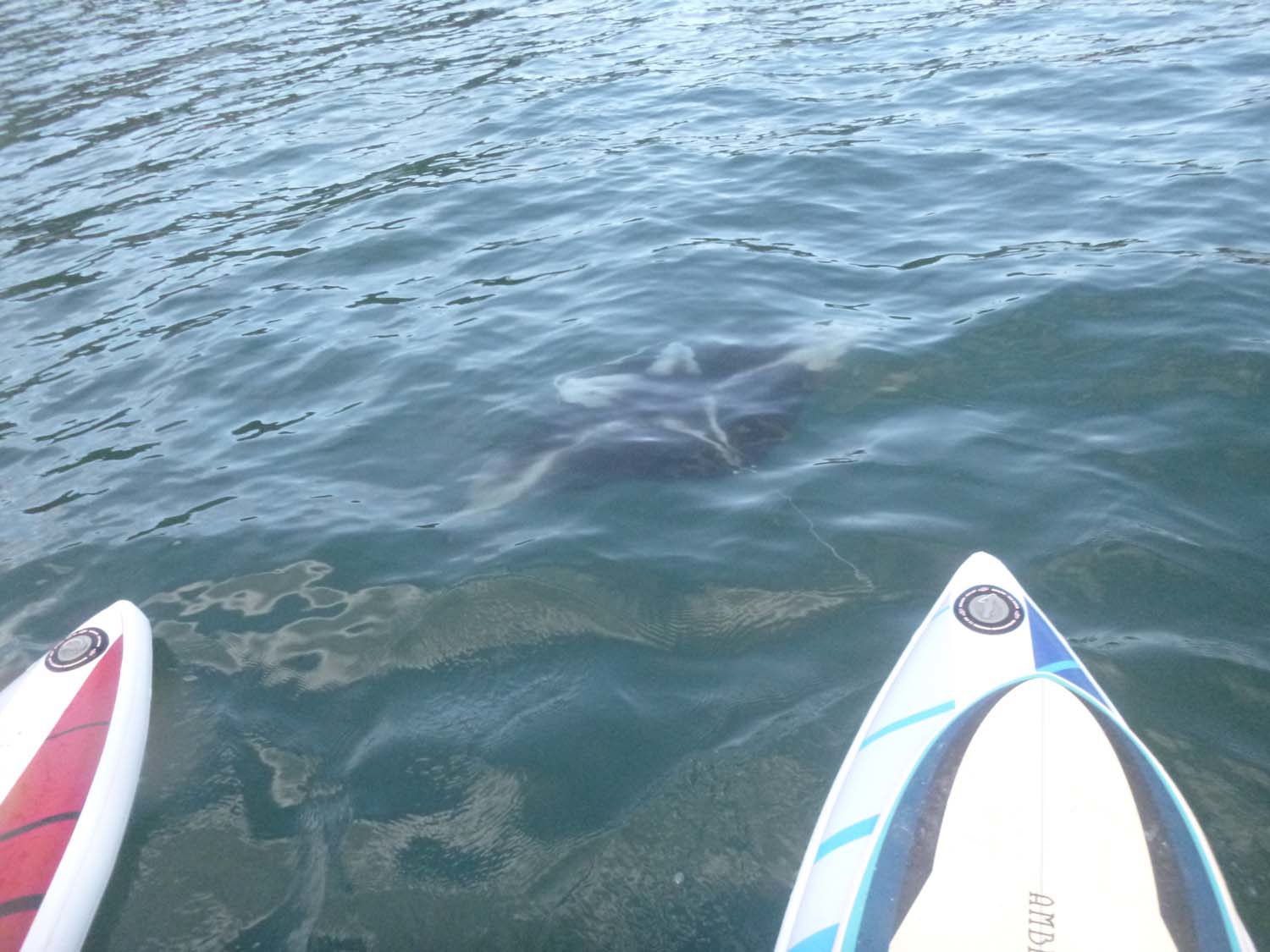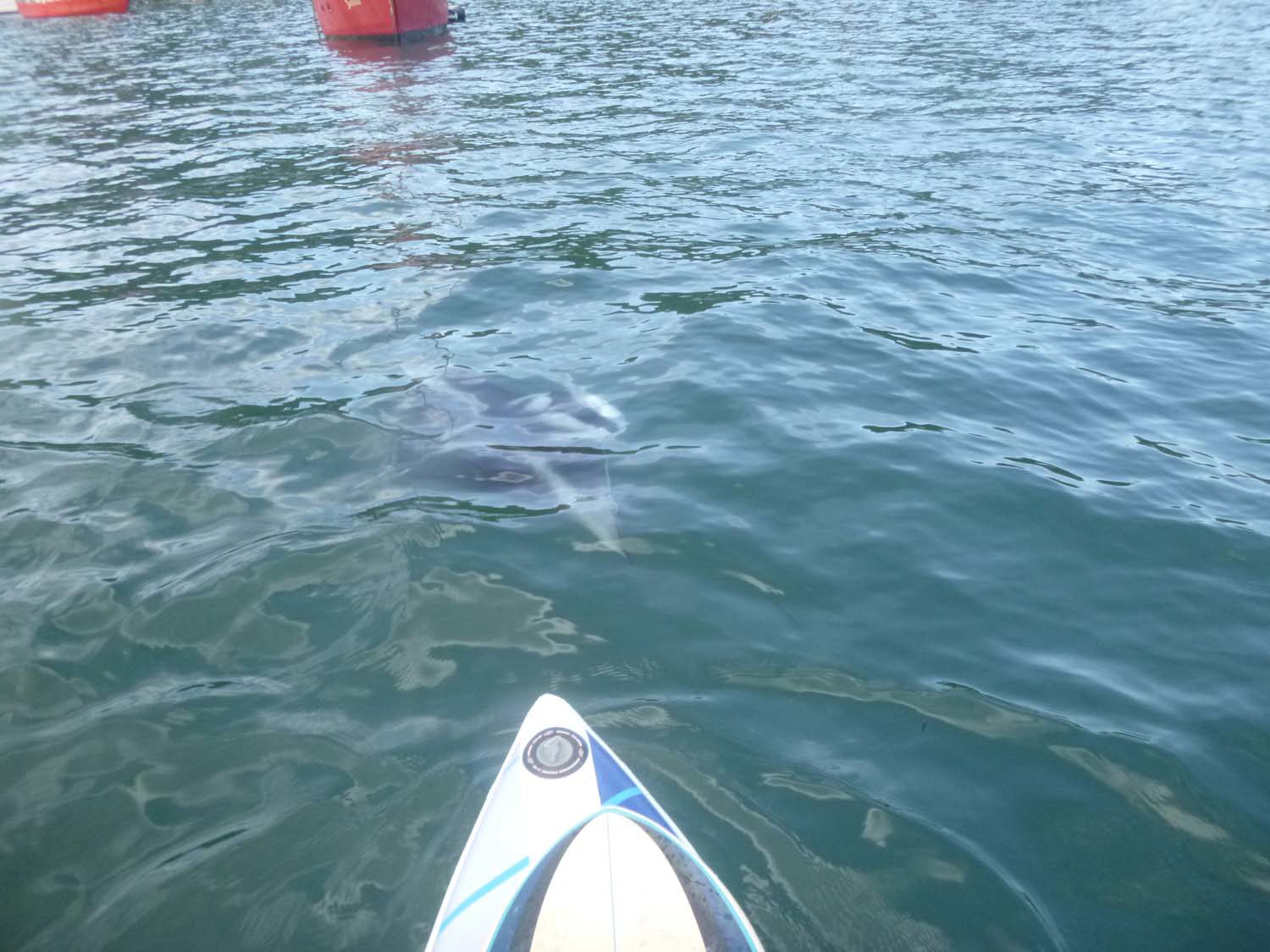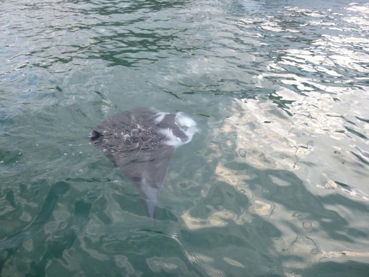 Malgré les fonds gris foncés peu engageants et l’eau particulièrement planctonique, nous nous baignons et observons les raie mantas qui viennent se nourrir en plein milieu de la baie. C’est en paddle que nous pouvons les approcher au mieux.