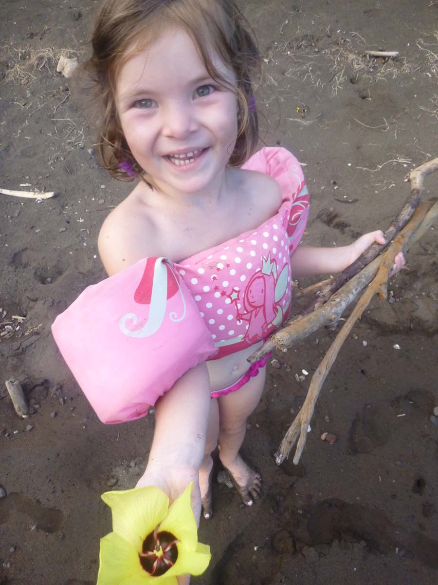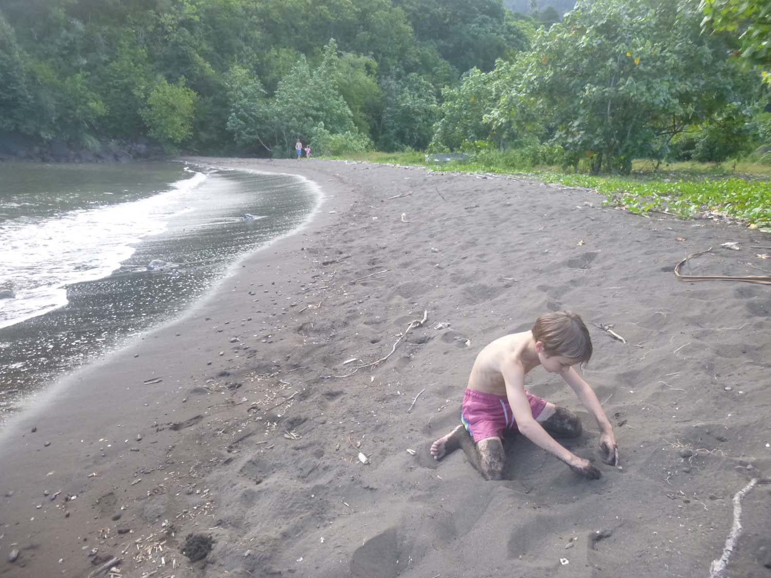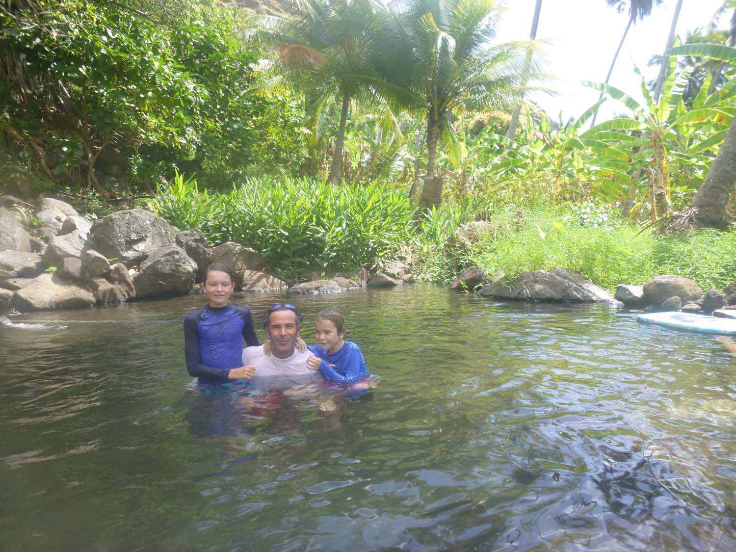 Nous sommes mouillés tout au fond de la baie, à quelques brasses de la plage de sable noir. Malgré la couleur peu attirante qui rend les fonds opaques, les enfants sont ravis de jouer dans le ruisseau : après 2 semaines de mers, tout le monde est ravi d’aller se dégourdir les jambes!