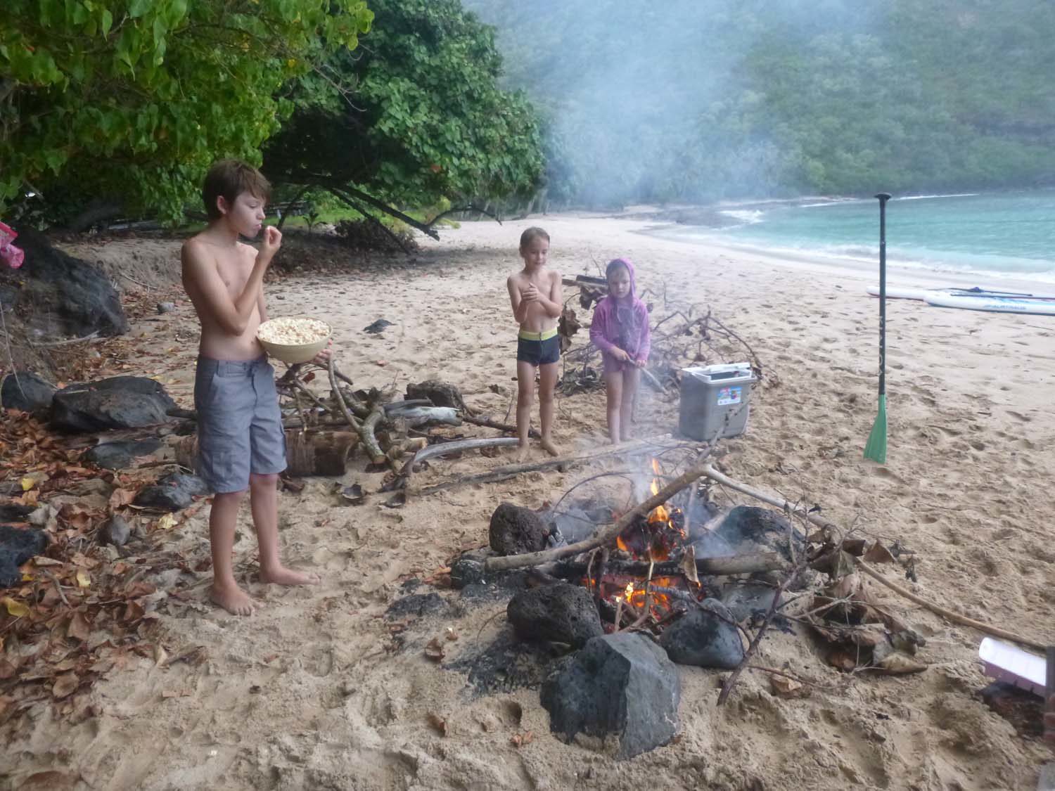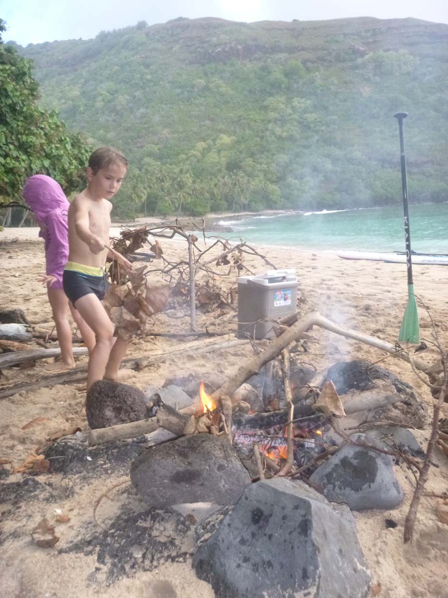 Nous ne manquons pas non plus d’organiser un « Bon Fire » (expression de nos amis ange-saxons) sur la plage, histoire de se retrouver entre copains, comme à notre habitude. Pas facile de dénicher le bon coin, qui ne gênera pas les riverains…. je sillonne la baie l’après-midi en annexe avec les enfants à la recherche d’une portion de plage inhabité : le premier spot identifié ne convient pas : un panneau « TABU » nous indique qu’il ne faut pas débarquer. Nous n’irons certainement pas braver cette interdiction, les croyances sont encore bien ancrées. Plus loin, ils y trop de maisons, mais au milieu, ce bout de terrain abandonné nous semble convenir.