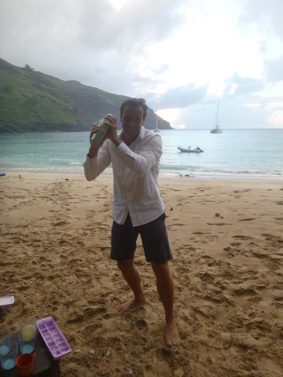 Papily et les enfants ont préparé les branchages avec l’aide précieuse de SylvainNous prenons l’apéro sur la plage. Les enfants nous ont aussi fabriqué une table en pierre et Sylvain des sièges en vieux cordage de marine