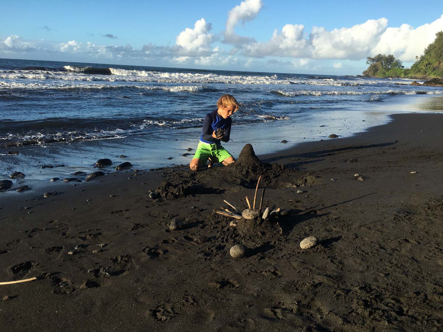 à 8h, je récupère la voiture auprès du loueur et file au supermarché faire le plein de surgelés et produits réfrigérés. Et en début d’aprèm, nous filons finalement au nord, direction Mahina : les garçons ont tout juste fini leur stage de surf la veille, mais veulent de nouveau surfer, et nous montrer le spot des écoles de surf.
