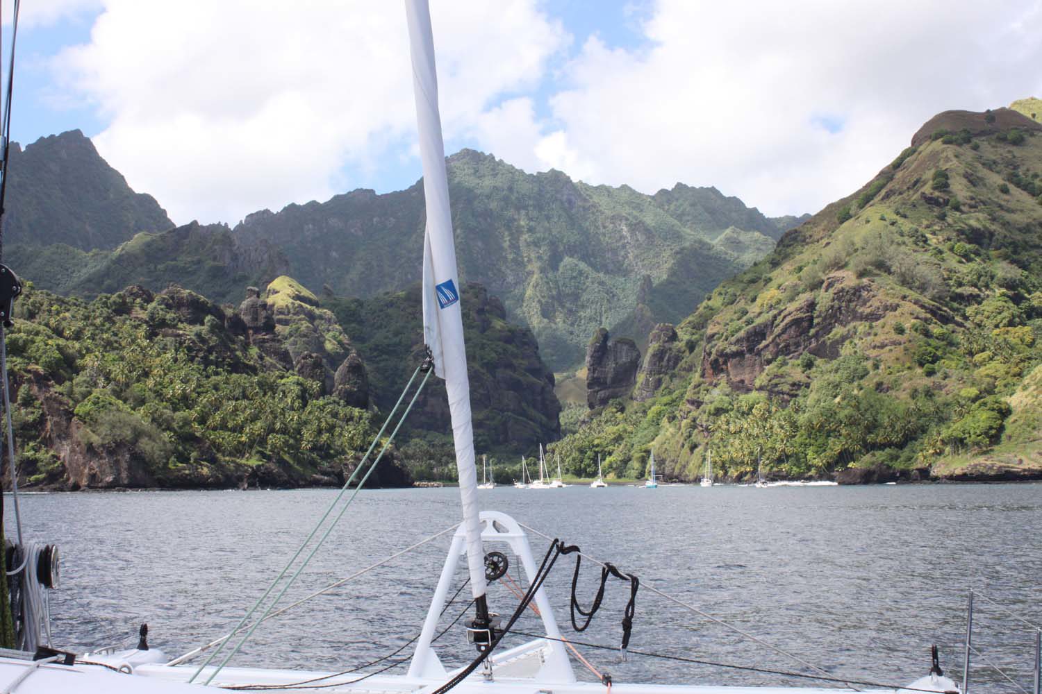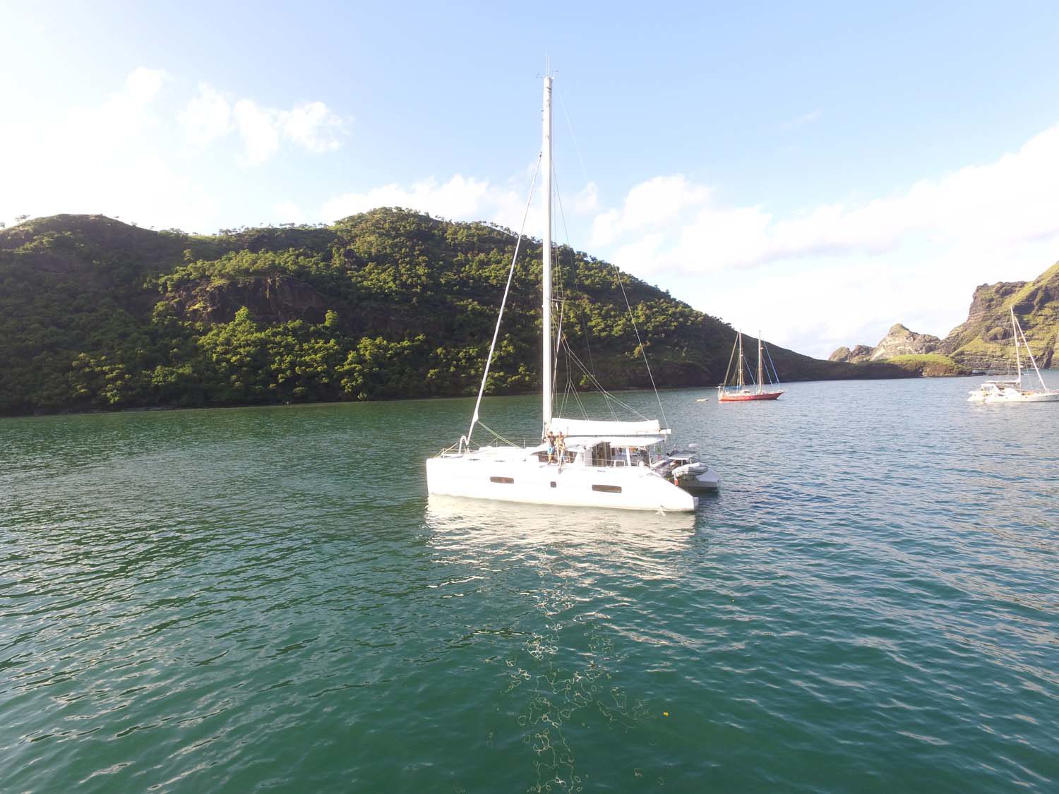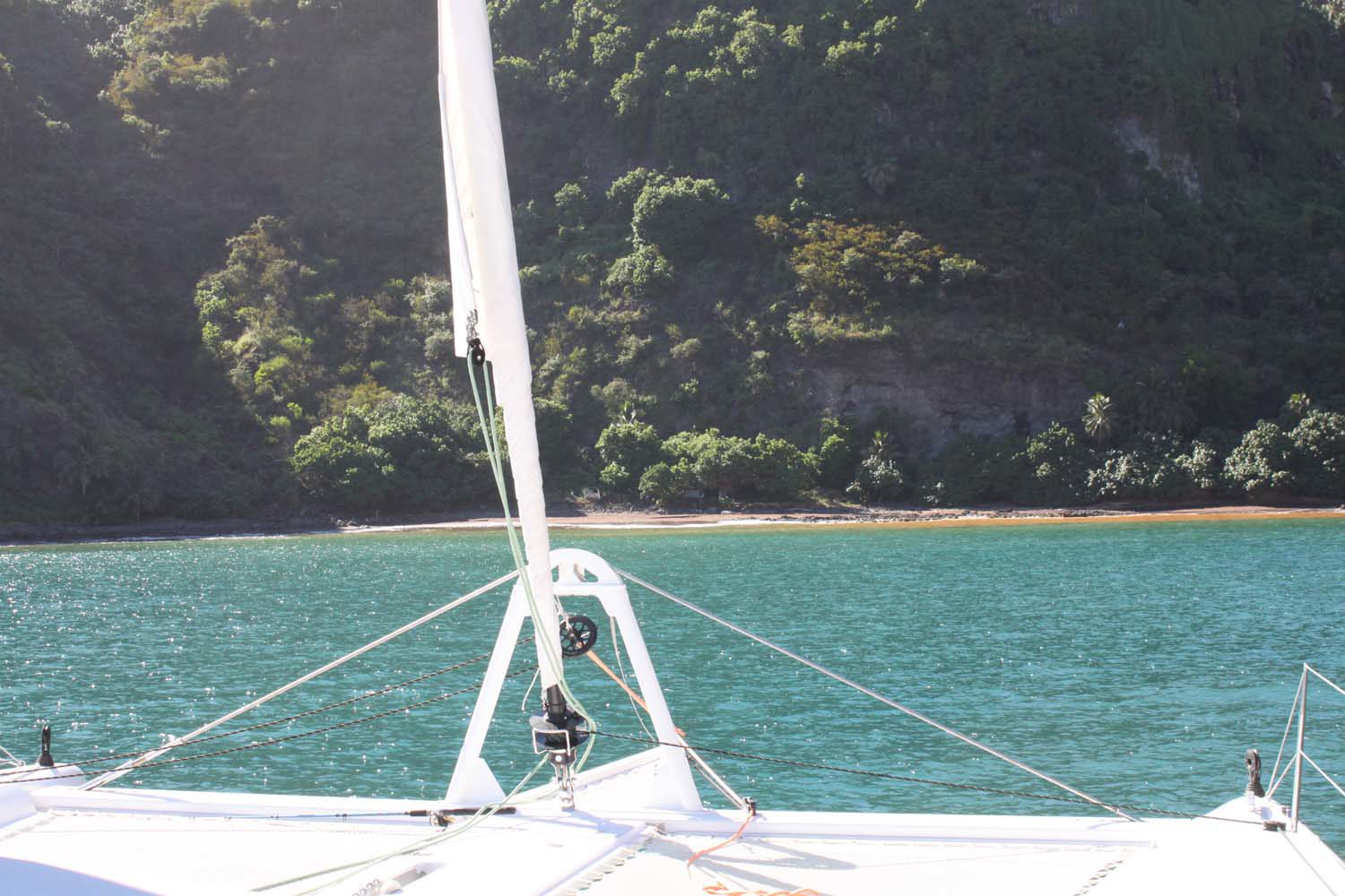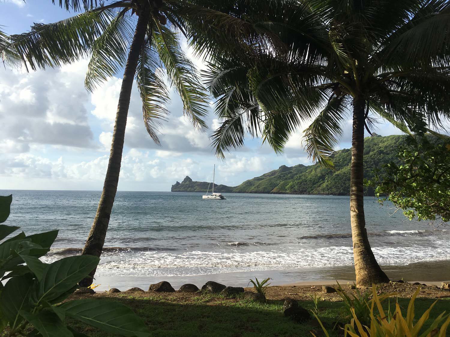 Motu One nous intrigue : un ilot de sable comme un atoll, alors que iles Marquises sont toutes des îles volcaniques sans barrière de corail. Après 2 semaines aux Marquises, sous le charme du paysage et de ses habitants, mais un peu fatigués des eaux verdâtres de ses baies, nous aspirons à un peu d’eau turquoise….