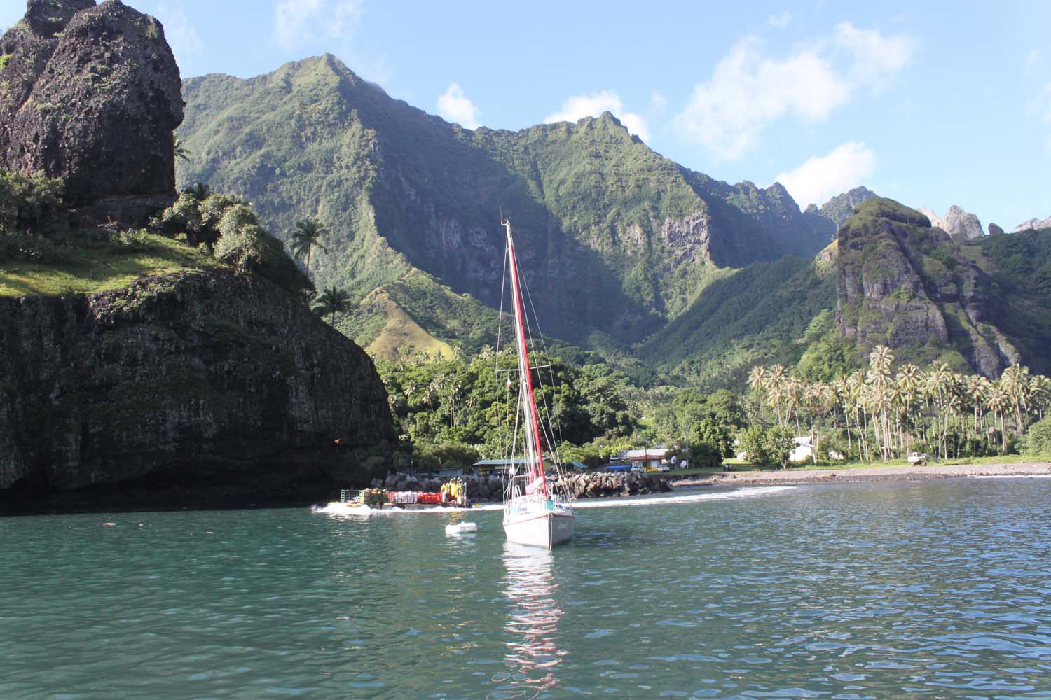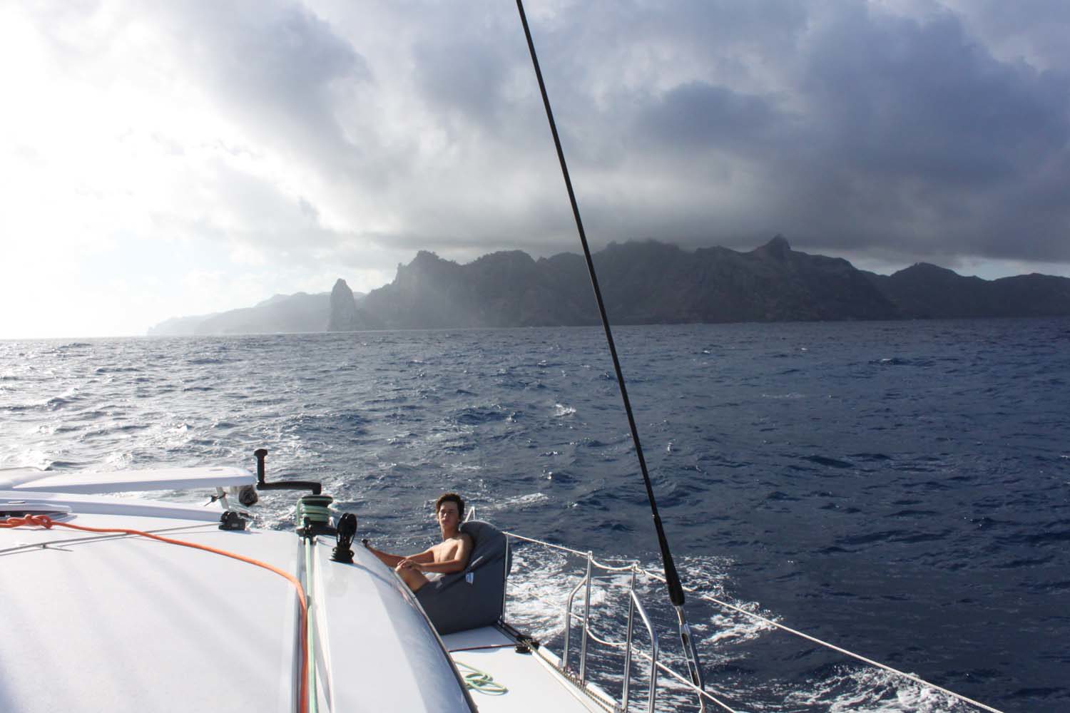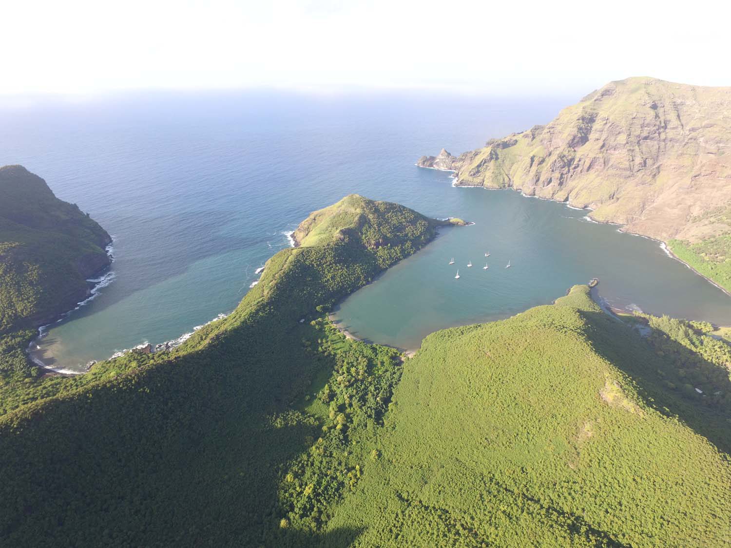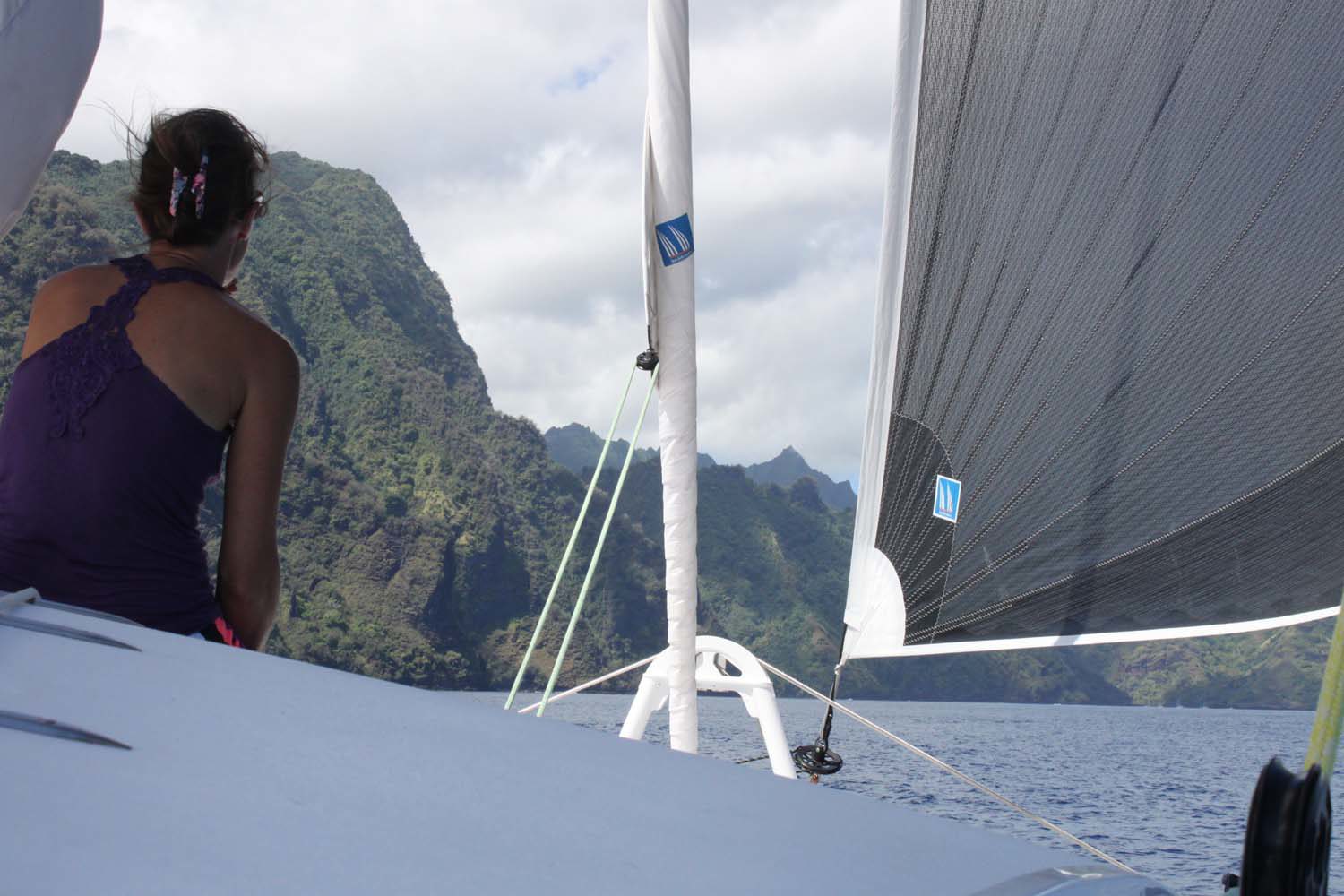 Motu One nous intrigue : un ilot de sable comme un atoll, alors que iles Marquises sont toutes des îles volcaniques sans barrière de corail. Après 2 semaines aux Marquises, sous le charme du paysage et de ses habitants, mais un peu fatigués des eaux verdâtres de ses baies, nous aspirons à un peu d’eau turquoise….
