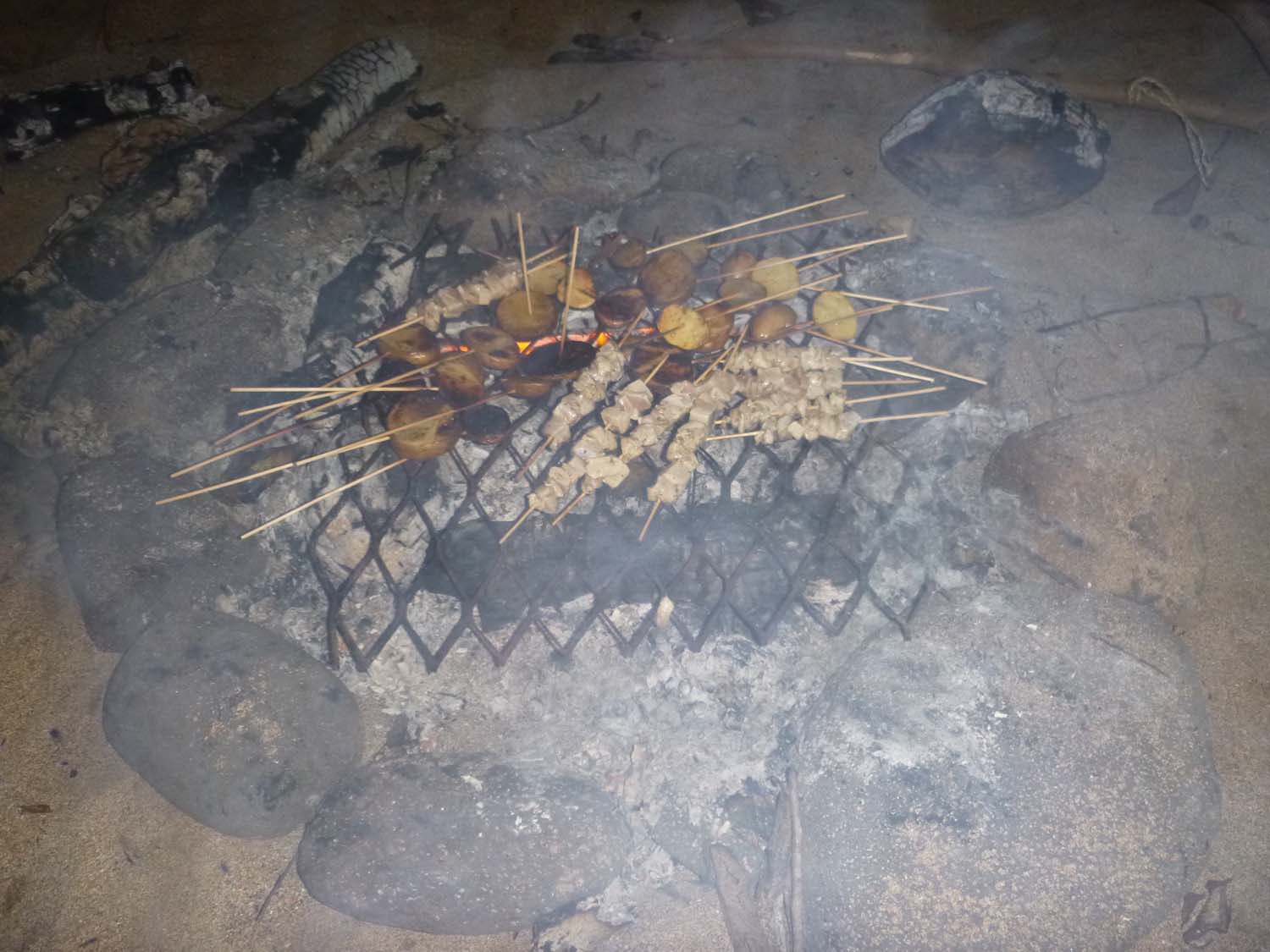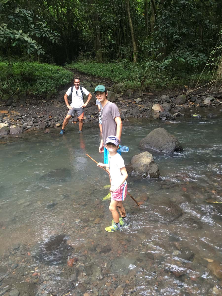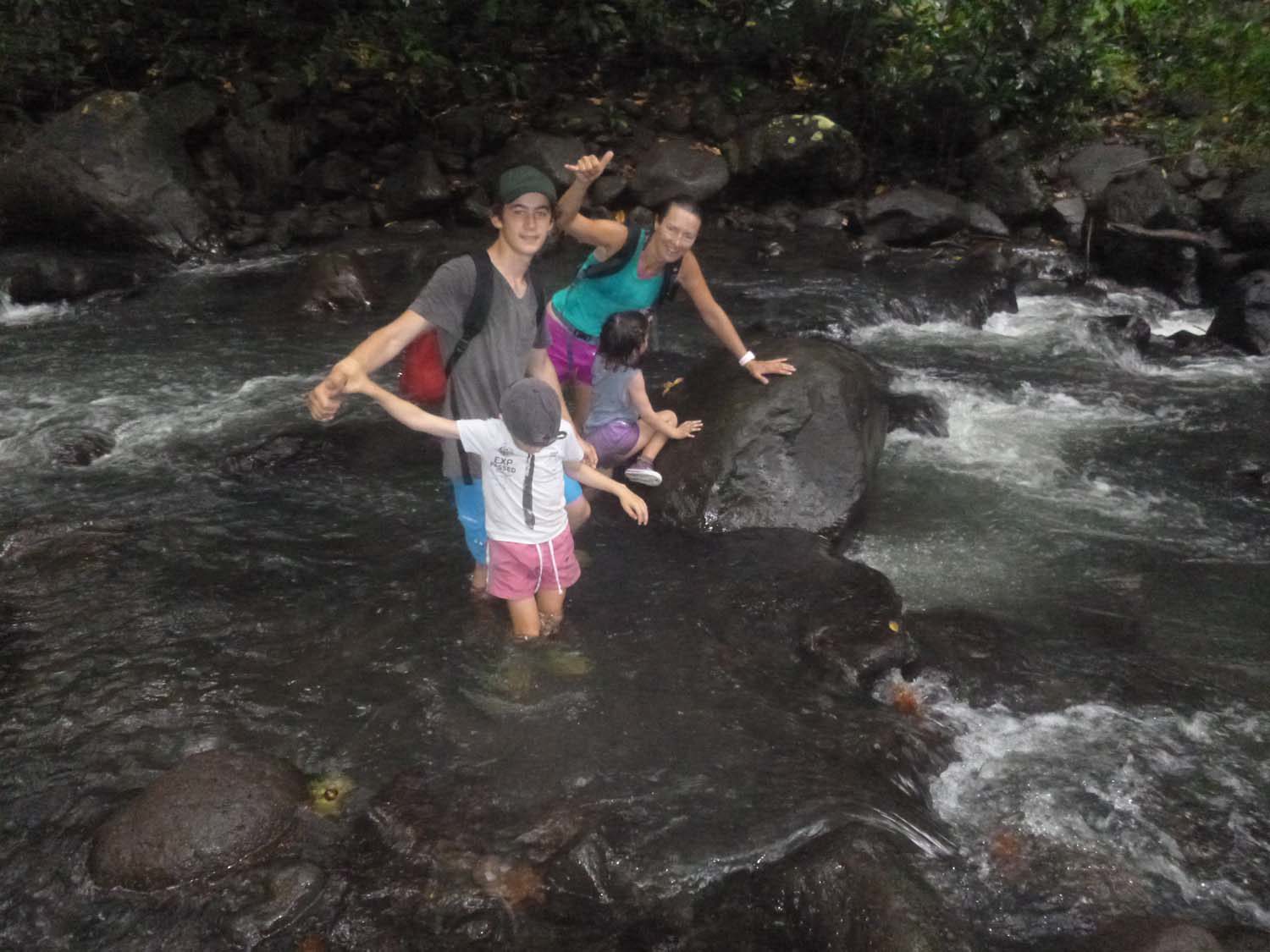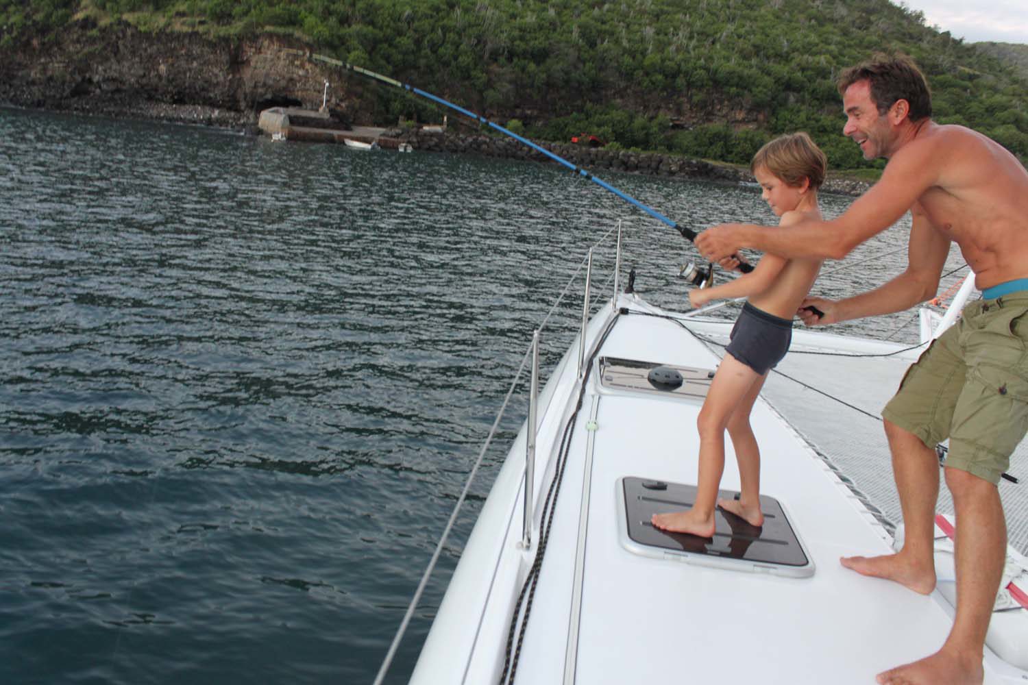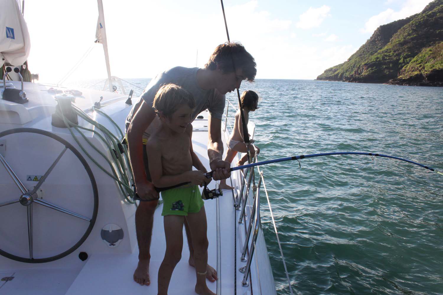 Finalement, ça mord, le pauvre Arthur hurle de joie- ou de peur??!, il tient un bébé requin au bout de sa canne! Heureusement, le bestiaux se décroche… Il y aura encore plusieurs touches, l’excitation de nos pêcheurs en herbe est à son comble . Pour ne pas blesser les requins, ils ont enlevé les hameçons, et arrachent simplement des bout de peau au bout de leur ligne, et ça marche! Quel spectacle.
