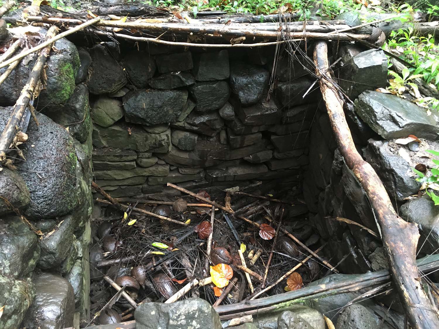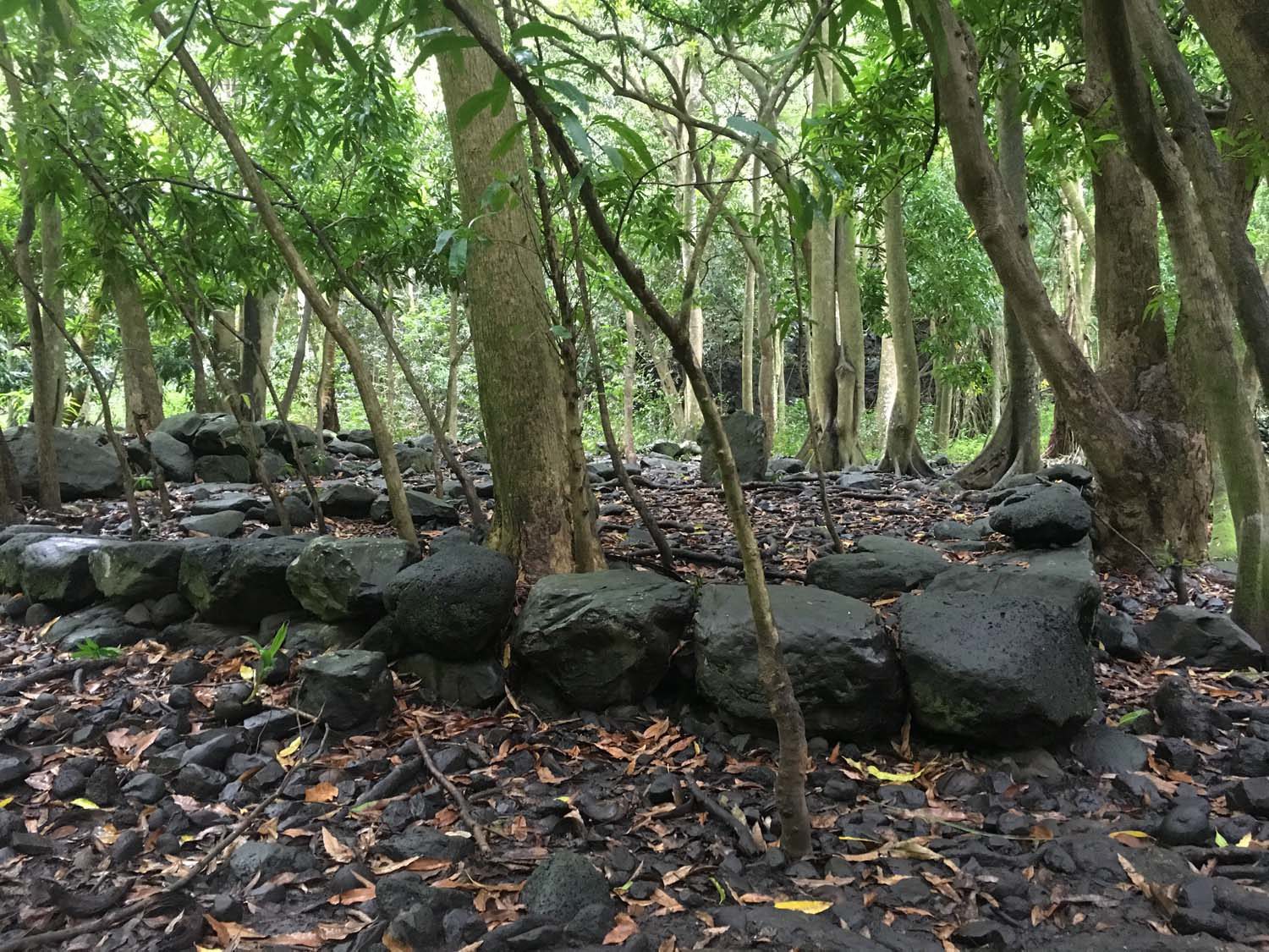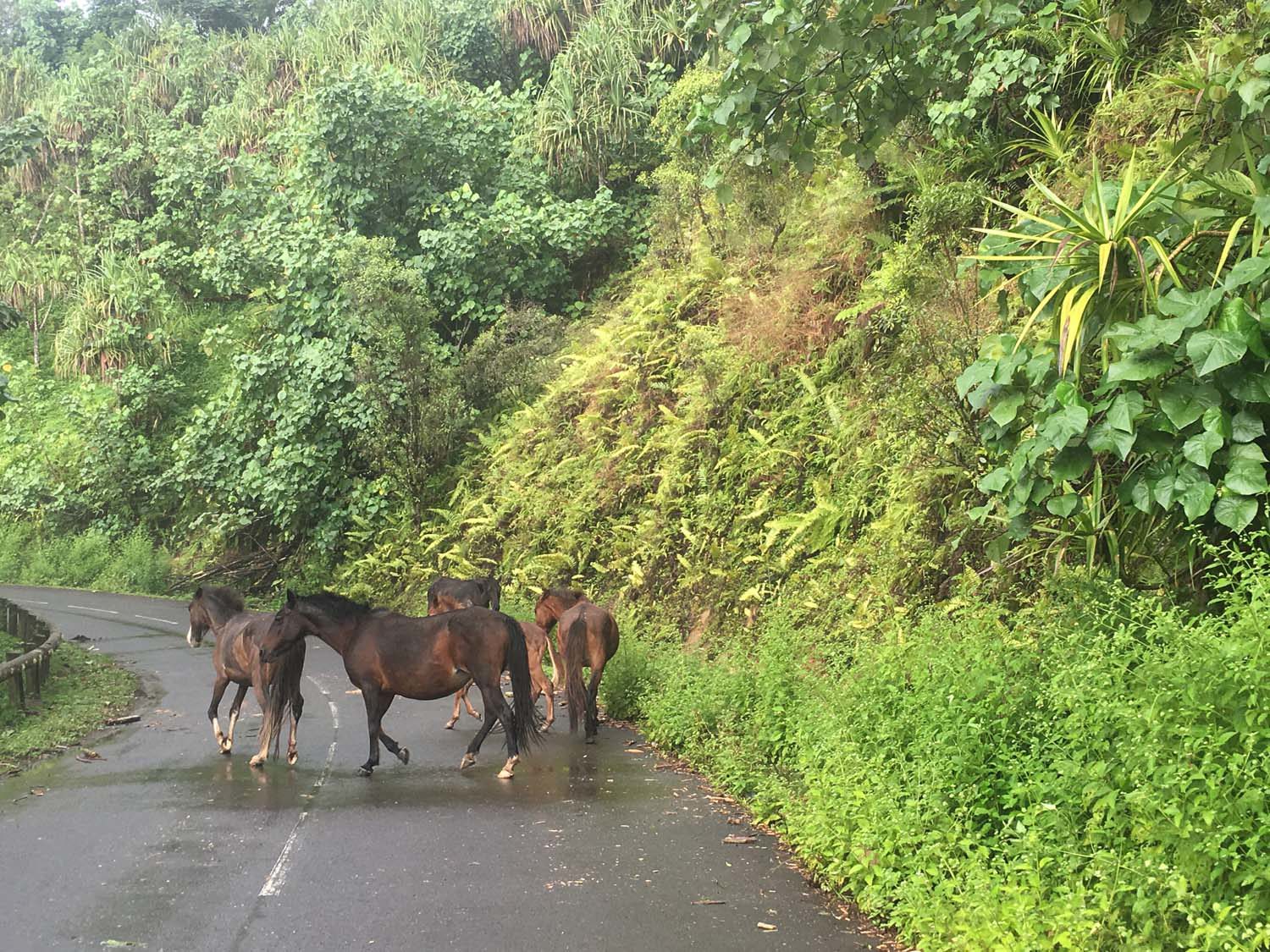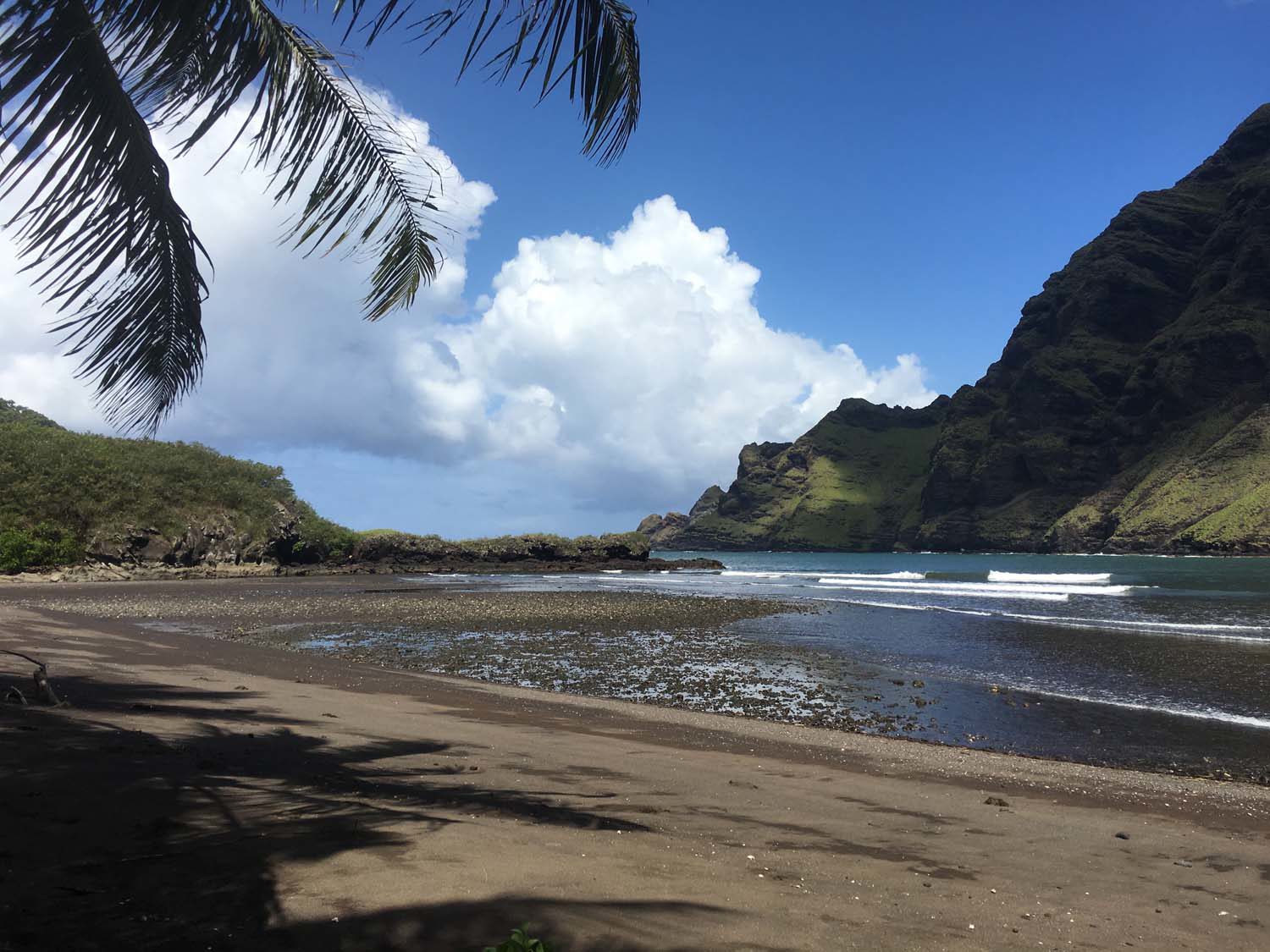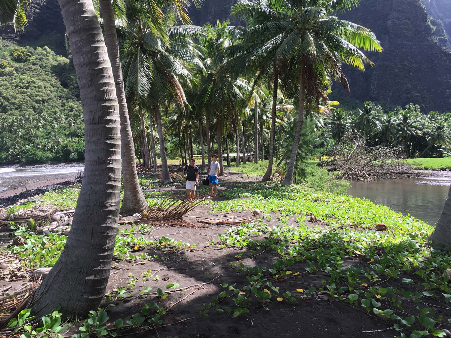Arrivés à EIAO, nous découvrons une baie très sauvage, plage de sable noire, et des eaux aux couleurs contrastées : noire, vertes et rouge, du fait d’une source d’eau ferrugineuse.