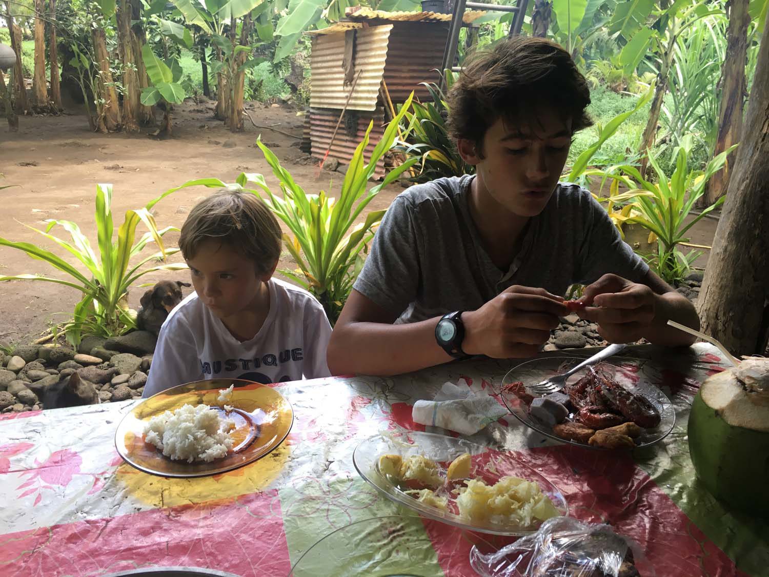 Les enfants essaient de la pêcher avec leur modestes cannes. Elle est attirée par le leurre, mais ne mord pas – heureusement pour eux, elle casserait leur leurre. Sur l’insistance des enfants, Loïc finit par tenter de la harponner, mais c’est une mauvaise idée : comme elle est blessée, son corps est sans doute chargé de toxines, il serait prudent de na pas la manger. Nous la laissons donc tranquille/… jusqu’à ce qu’une autre carangue vienne la rejoindre : elle nous narguent!