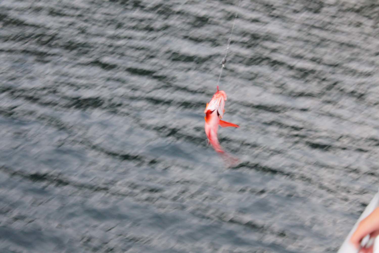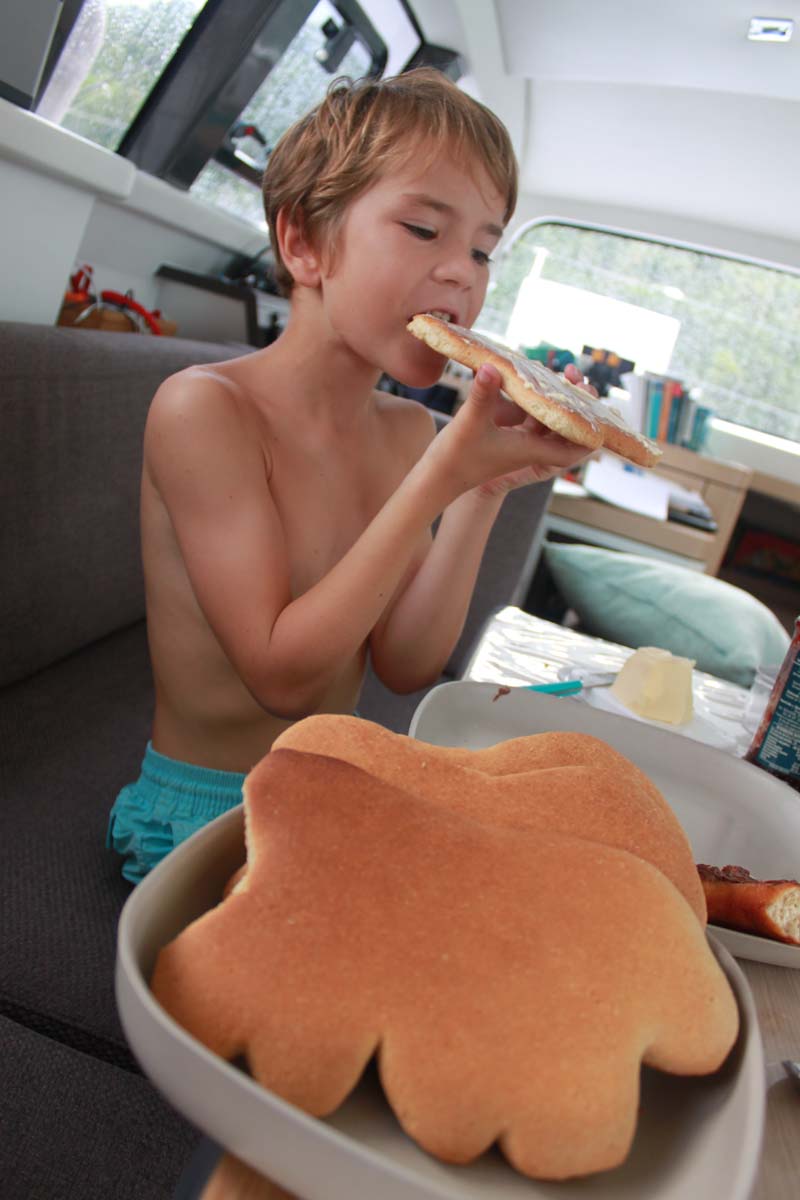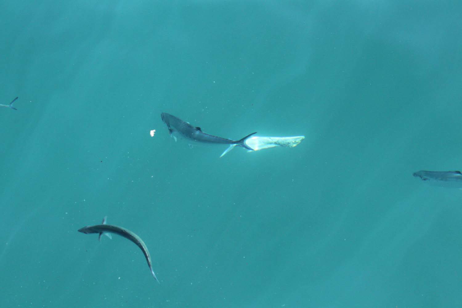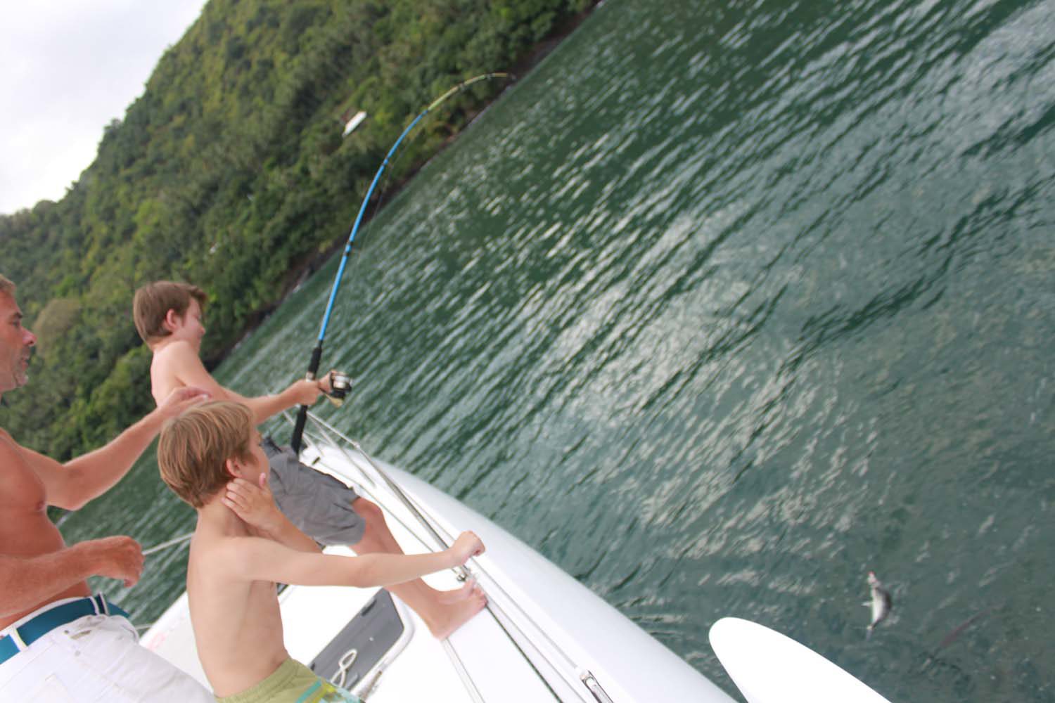 Entre temps, c’est un carangue arc en ciel qui mord, et c’est Gautier qui la remonte. Le temps de la préparer en filets, je jette la carcasse à l’eau… ce qui attire de petits requins pointes noires. Les enfants sont aux anges, ils me réclament des restes pour apater les bestioles : il me reste les 4 peaux de mes filets!