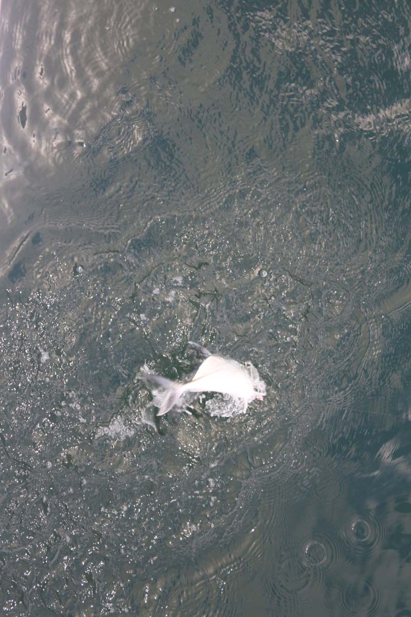 En fin de journée, les 2 grosses carangues sont toujours là, Loïc décide de sortir la grosse artillerie, et remet en ordre sa grosse canne de lancer, de l’époque de Maurice où il allait pêcher la carnage géante dans les passes. Finalement, c’est une « modeste » carangue de 5 kg qui mord! les 2 « big mamas » sont restées sagement au cul du bateau s’abriter et manger nos restes….