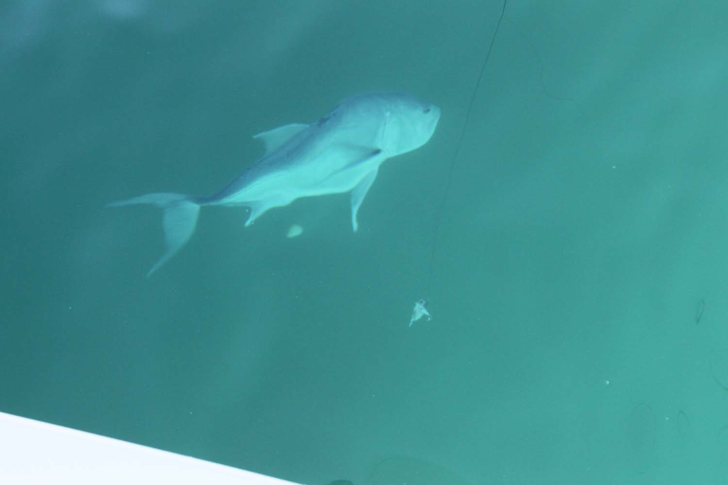 En début d’après-midi, nos apercevons sous la bateau une énorme carangue : elle semble blessée, : elle porte une trace sur le dos de blessure fraiche, un requin sans doute. …