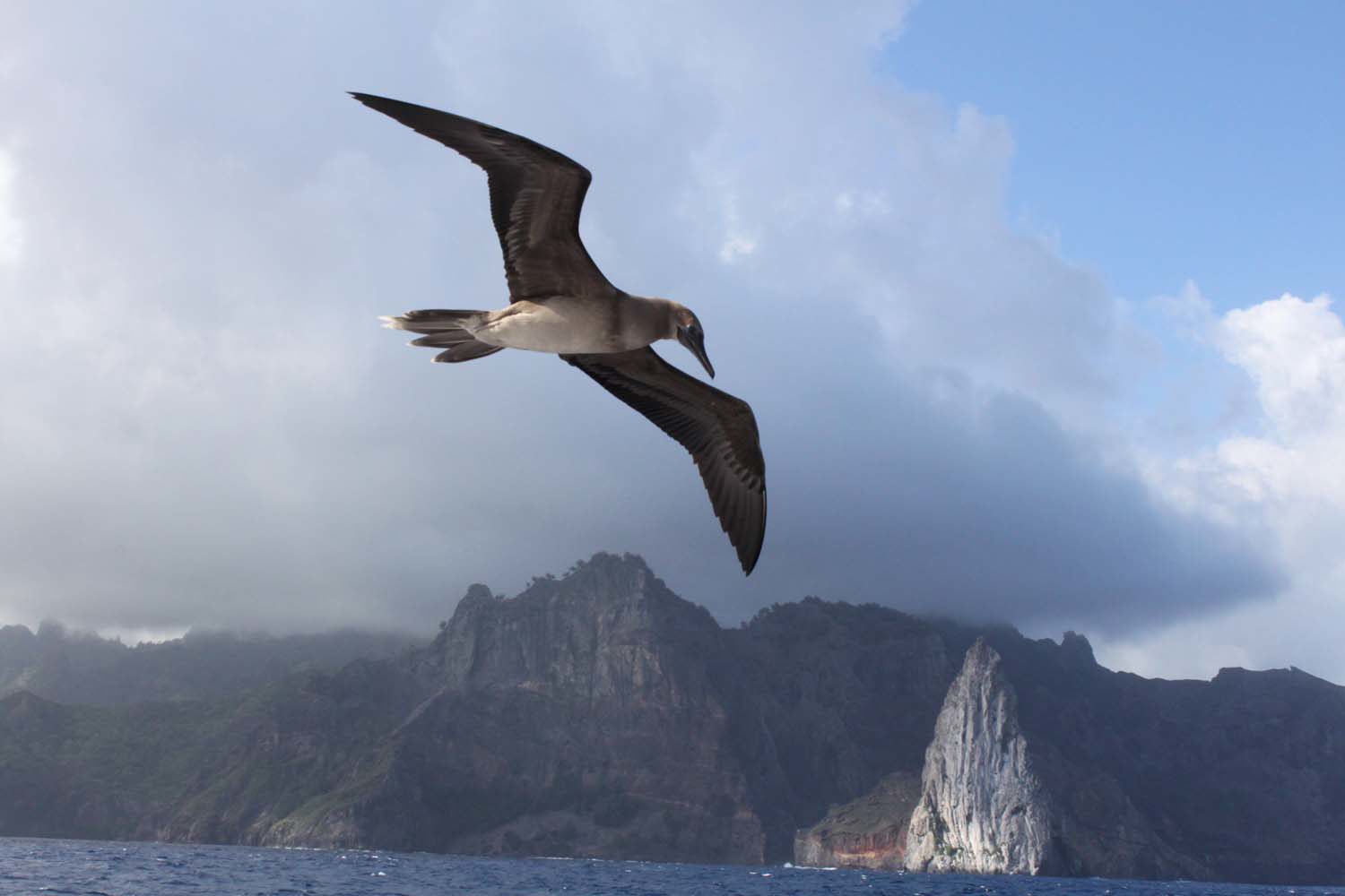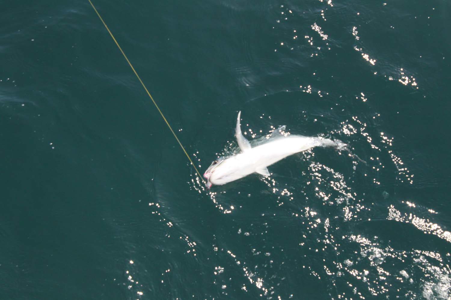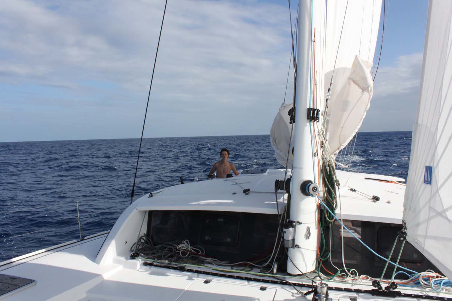 En effet, des nuées d’oiseaux de mer apparaissent, sternes, fous chassent dans tous les sens : nous dévions légèrement la route pour nous retrouver en plein milieu d’une chasse : le cliquet démarre, ca tire très fort, un thon jaune!! Nous manoeuvrons pour la seconde fois, roulons le solent, bordons la GV, ralentissons le bateau : il est superbe, une bonne vingtaine de kilos, Loïc le remonte en une dizaine de minutes, je tarde un peu à retrouver le crochet, pour le sortir de l’eau…. et un requin nous attaque notre poisson… à 3m de nous et devant nos yeux ébahis, notre thon est gobé, proprement, sans rien en laisser…. nous sommes dépités… adieu sushis, sashimis. On dit souvent à la pêche que le poisson a toujours sa chance, mais là, c’est plutôt l’illustration pure de la chaine alimentaire.