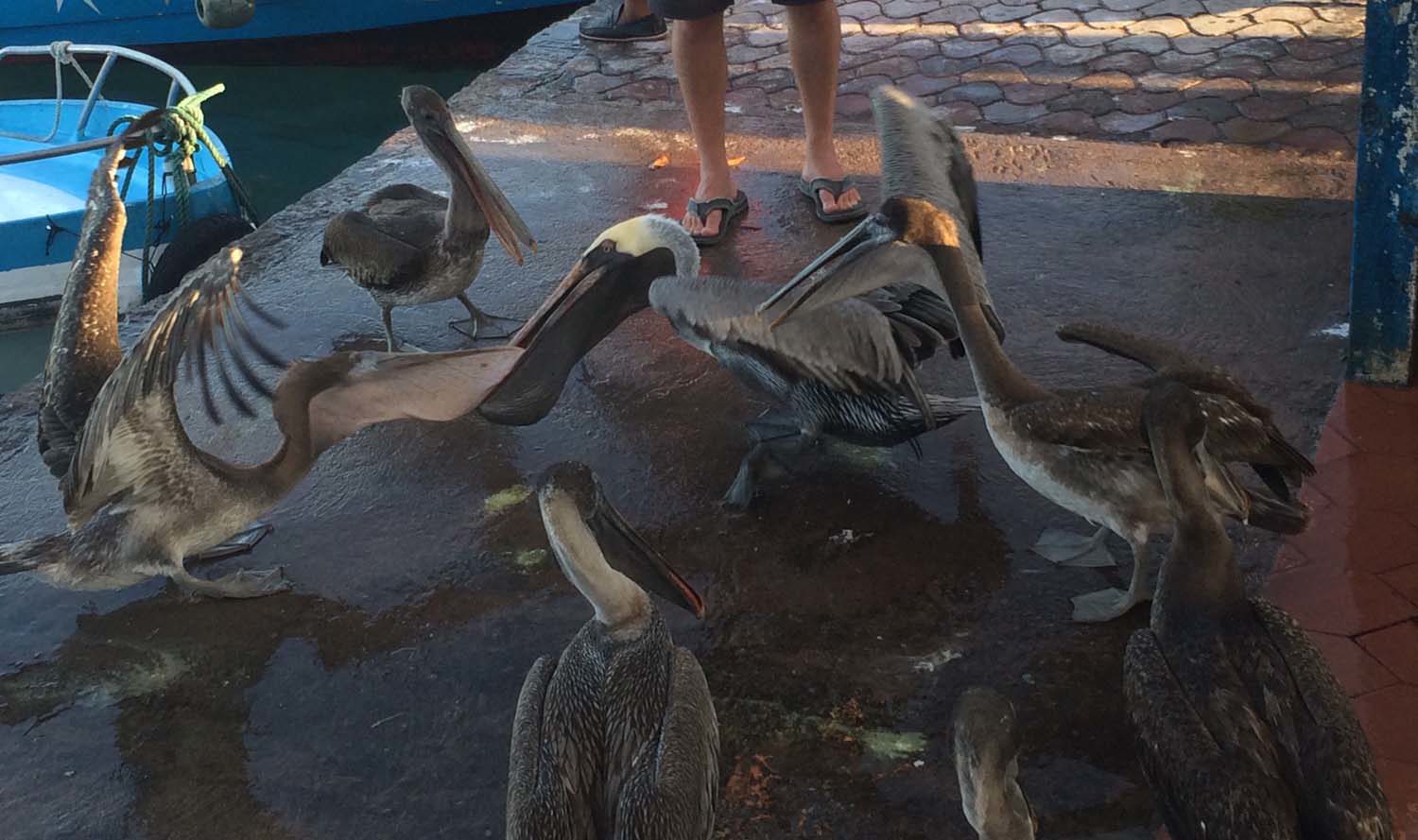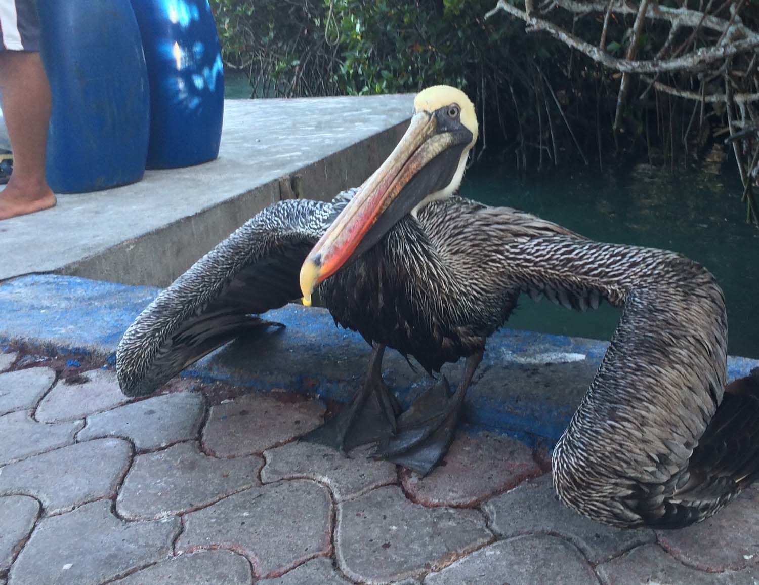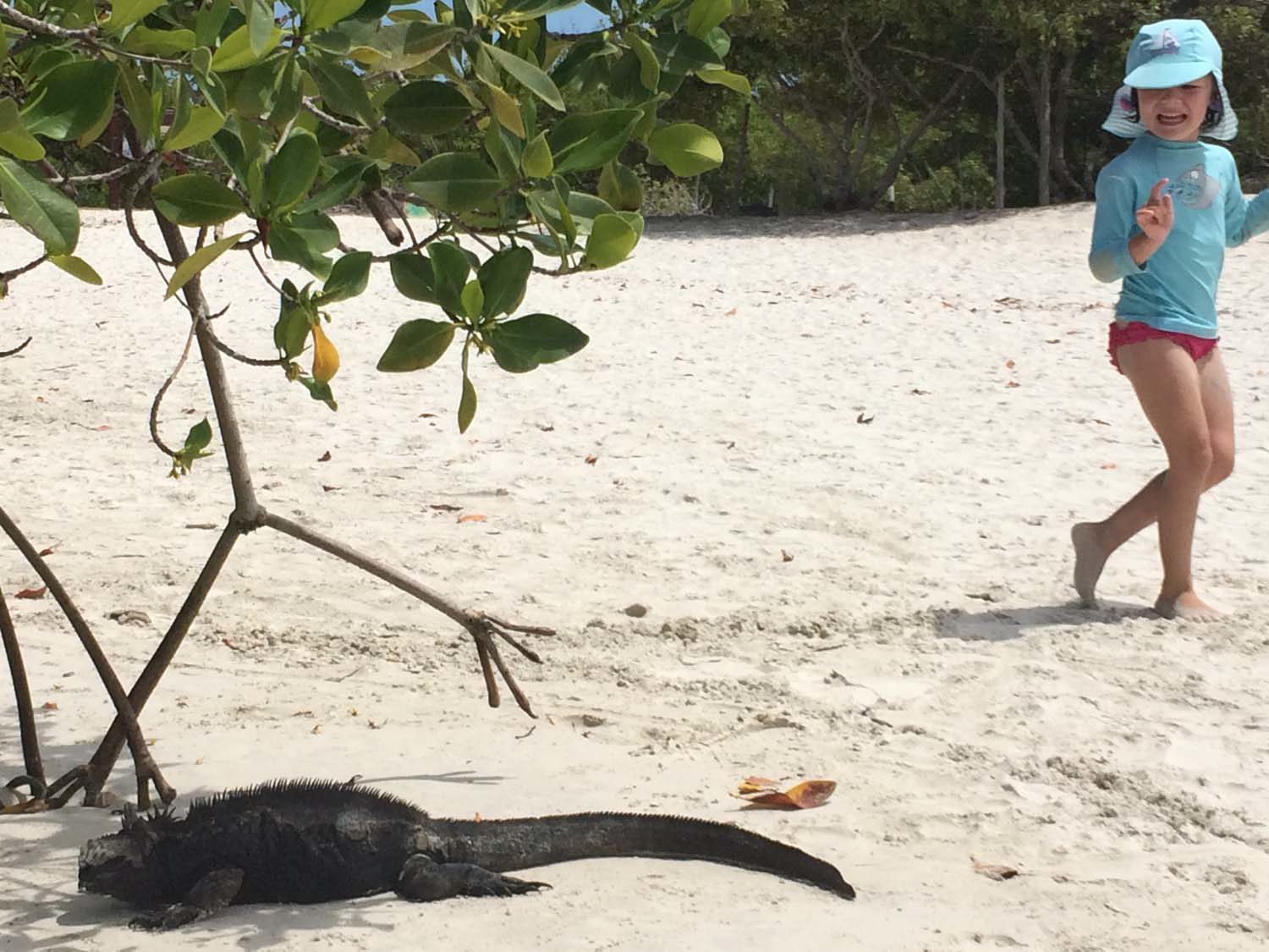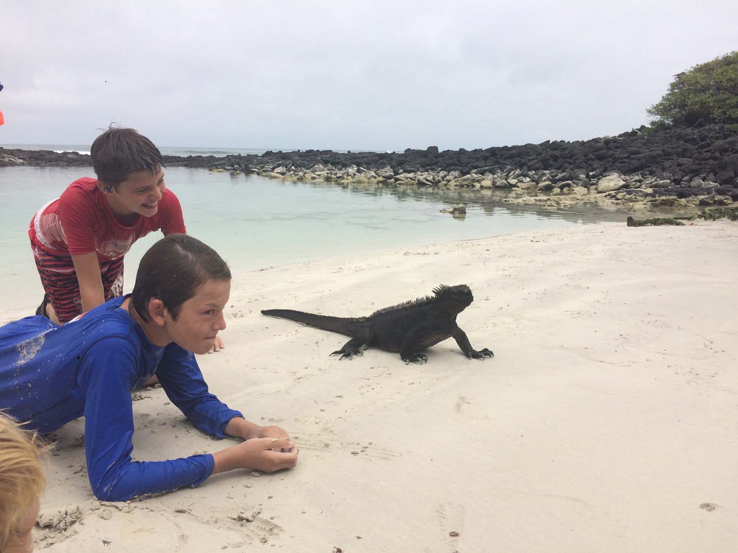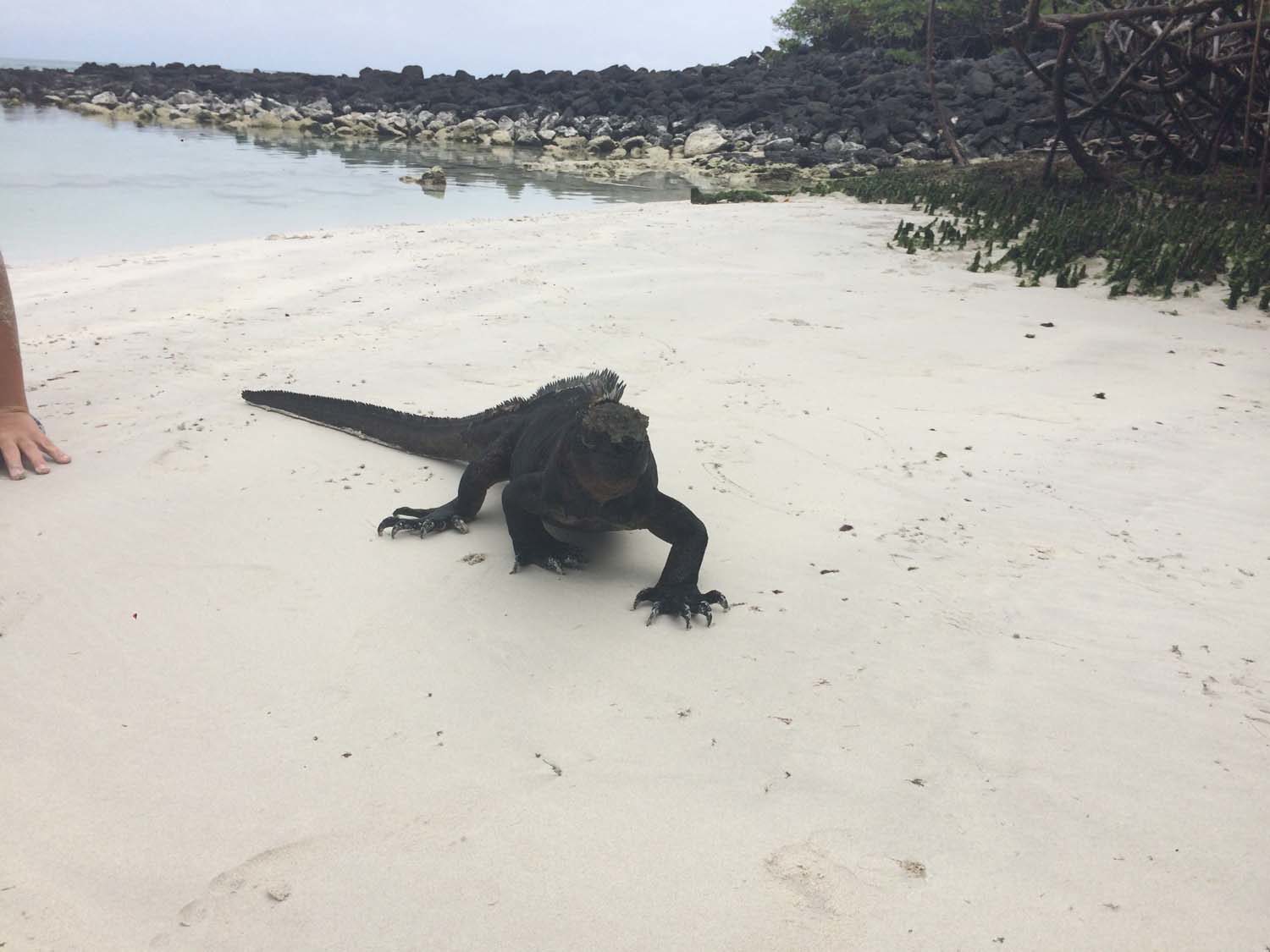 C’est notre premier contact avec les iguanes marins, qui ont des têtes et des corps impressionnants, très foncés de couleur, couverts d’écailles et d‘épines, avec un air patibulaire…. cependant, ils sont complètement inoffensifs puisque végétariens, et se nourrissant exclusivement d’algues : ils n’y a aucun risque de se faire croquer le pied! Ils sont en plus très lents, vraiment aucun risque donc!