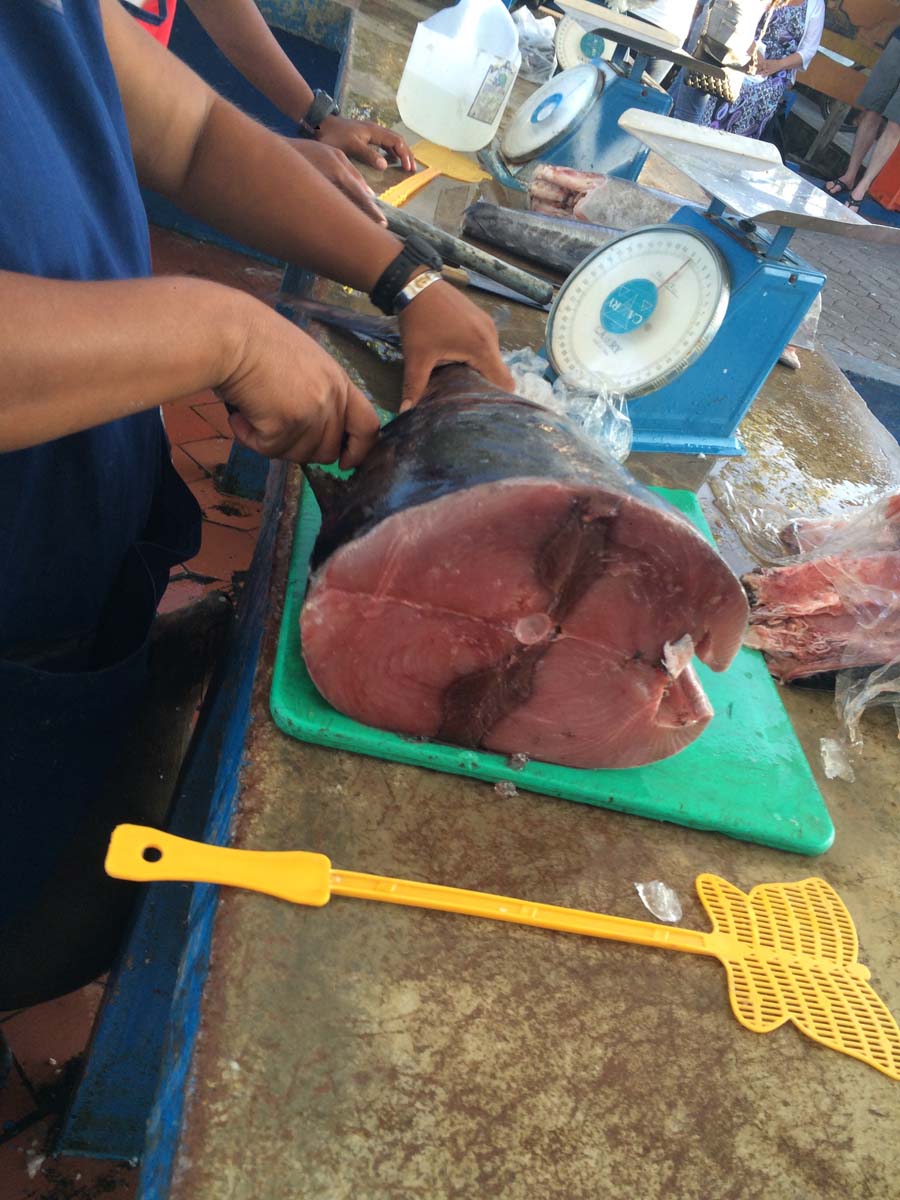 Dès le premier soir, nous allons à terre nous faire un poisson grillé dans un foodcourt original : une ruelle bordée de gargotes, qui se transforme le soir en resto géant . La formule est sympa : ruelle est bouclée, les tables et chaises sont descendues dans la rue, et la cuisine se fait aux BBQ. Au débarcadère, dans les lumières du soir, bébé-raies et requins passent et repassent ; une vraie nurserie.