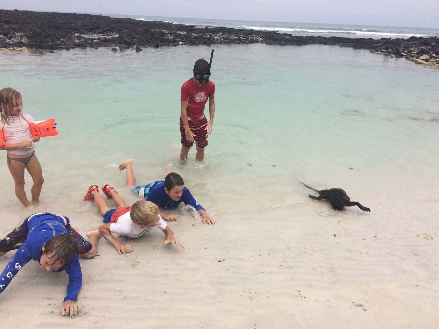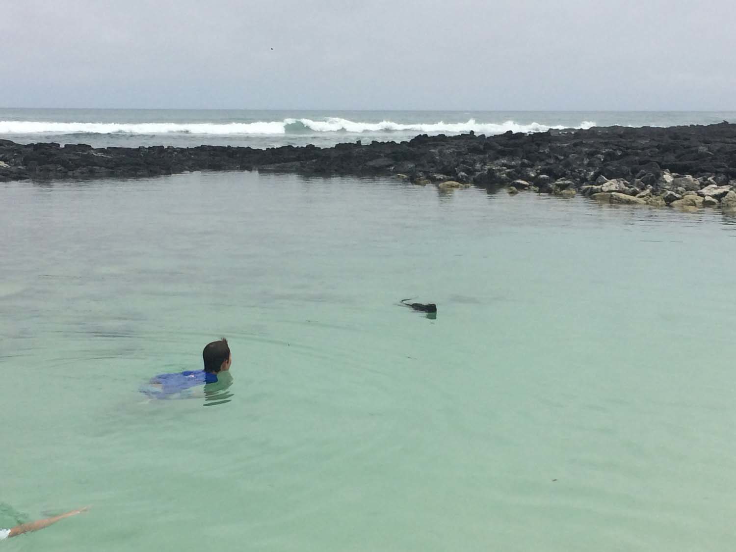 La chaleur est accablante, avec ce soleil équatorial et la mer terriblement rafraîchissante avec ses 22°. Le retour se fait par une jolie plage fréquentée par les habitants… et des otaries bien sûr.