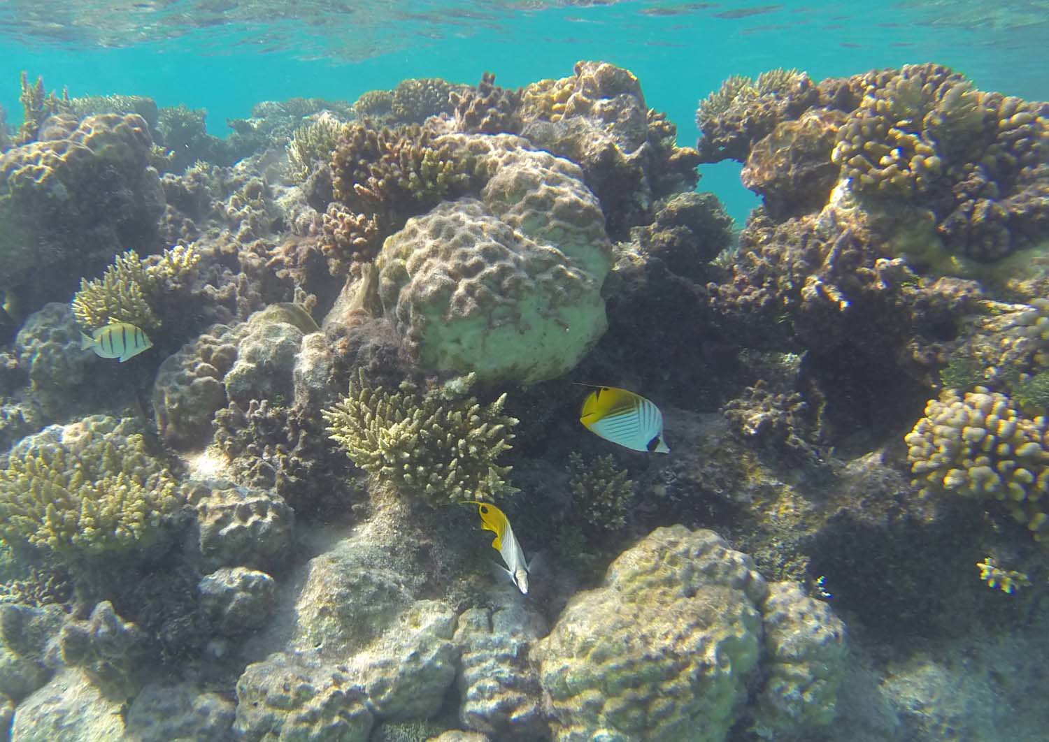 Avec Arthur et Anna, nous allons tous les jours à l’aquarium, magnifique site de snorkeling, où dans 2m d’eau on aperçoit tous les poissons de lagon, de récif, y compris des requins pointe noire, des murènes, des poissons lion, poissons trompettes, ange, empereur, papillon, etc…