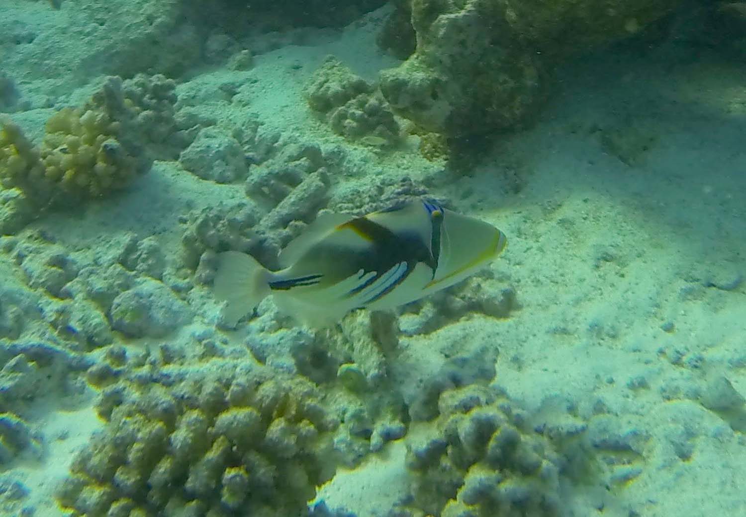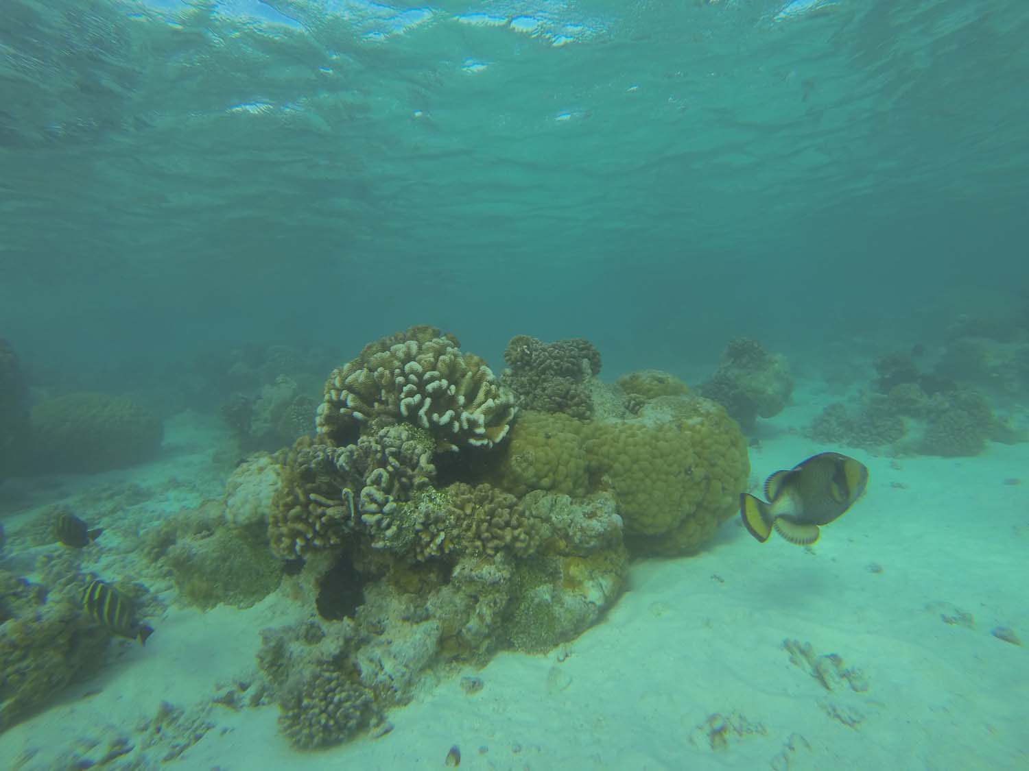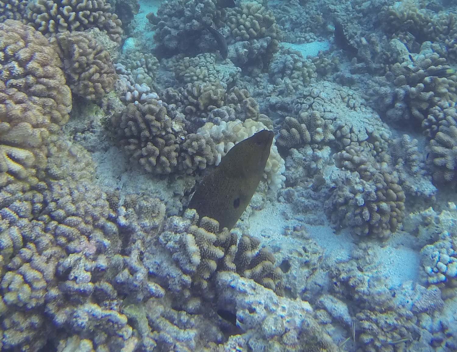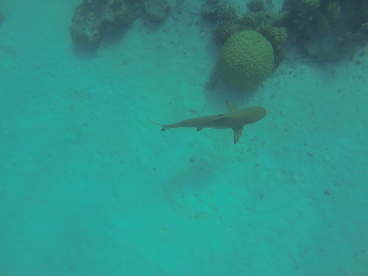 Nous n’avons pas testé la passe de Tehere au nord, car le snorkeling était suffisamment spectaculaire le long de la plage, avec une impressionnante tête de corail d’une bonne vingtaine de mètres de diamètre, regorgeant de petits et de gros poissons : énormes mérous de plus d’un mètre de long, perroquets par dizaines, et aussi jolis petits poissons coralliens, et bien sûr, un ou deux petits requins pointe noire qui trainent par là, on s’y fait! Pour l’occasion, nous avons ressorti la GOPRO du placard – il nous manquait le cable pour la charger!!